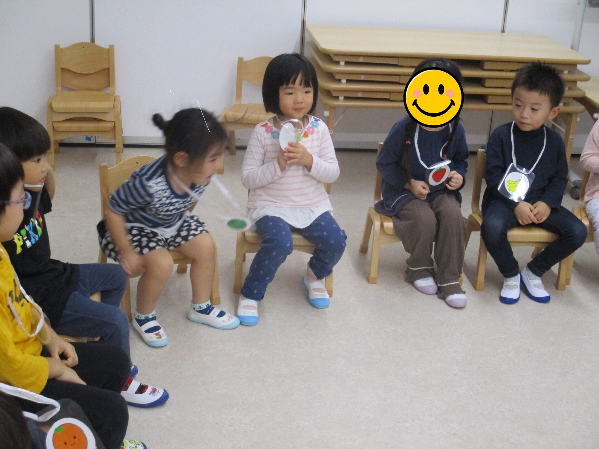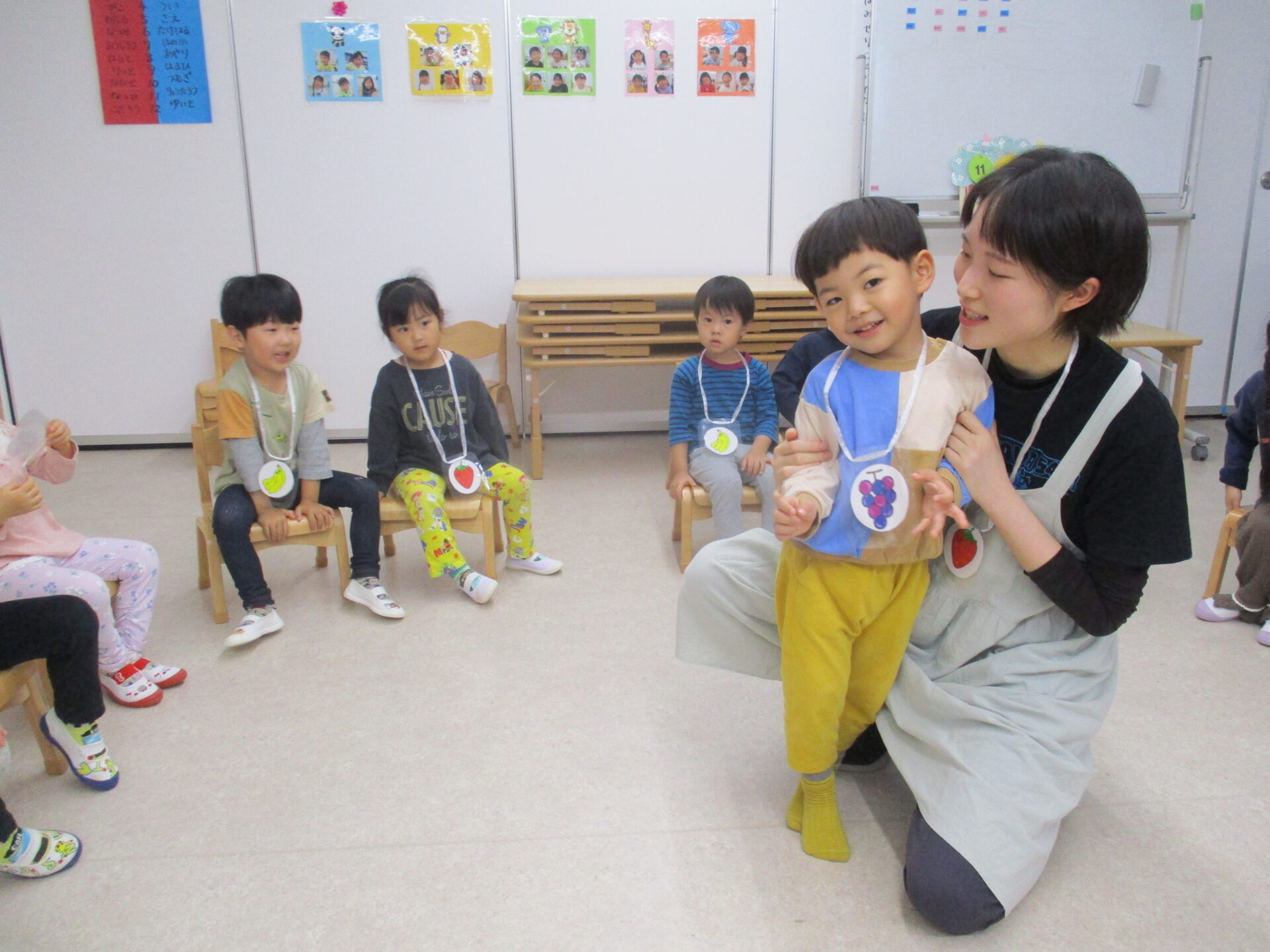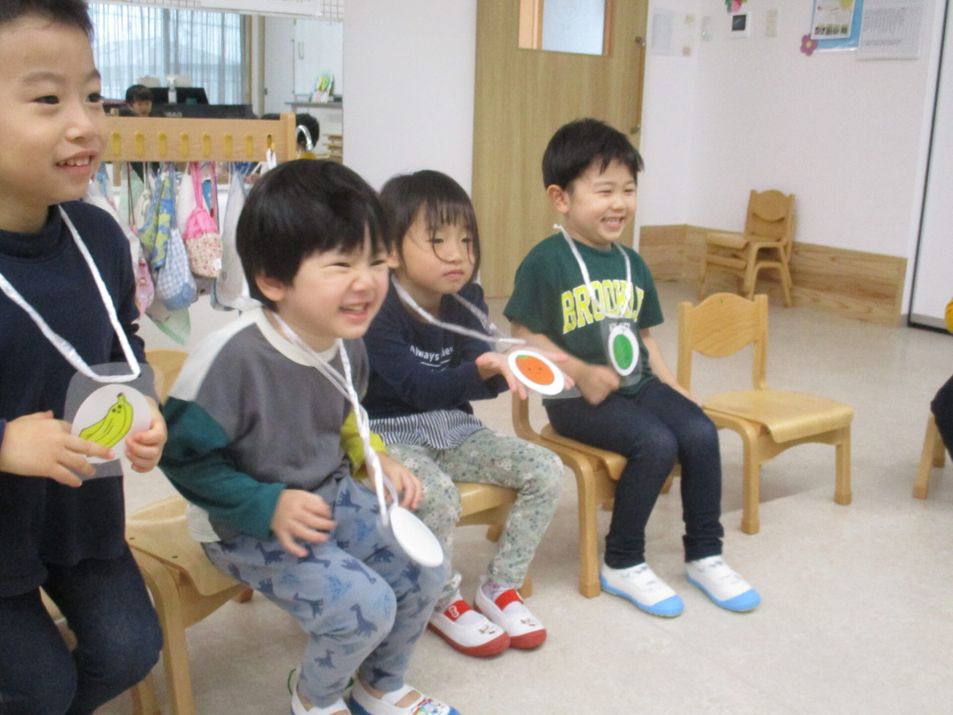 1人1人わかりやすいように果物のカードをかけ、呼ばれたら急いで空いている椅子に移動!!