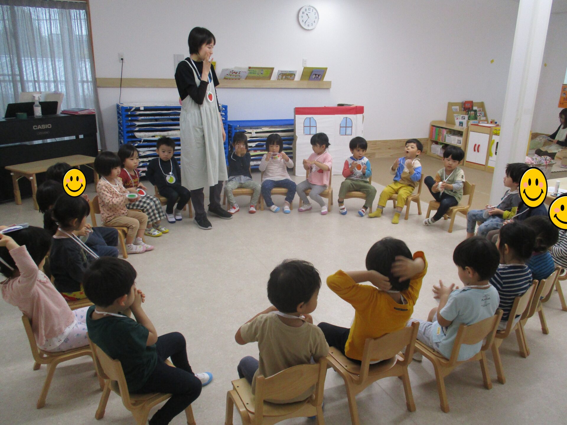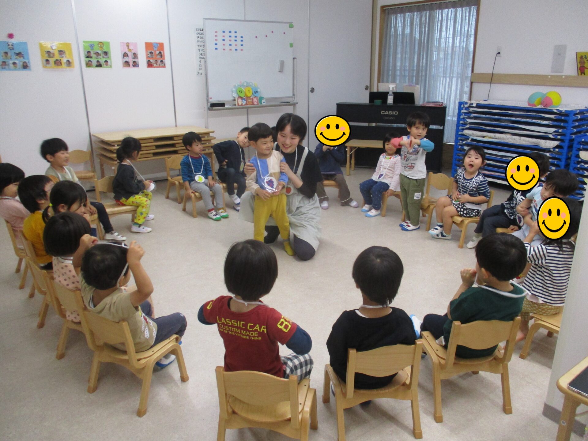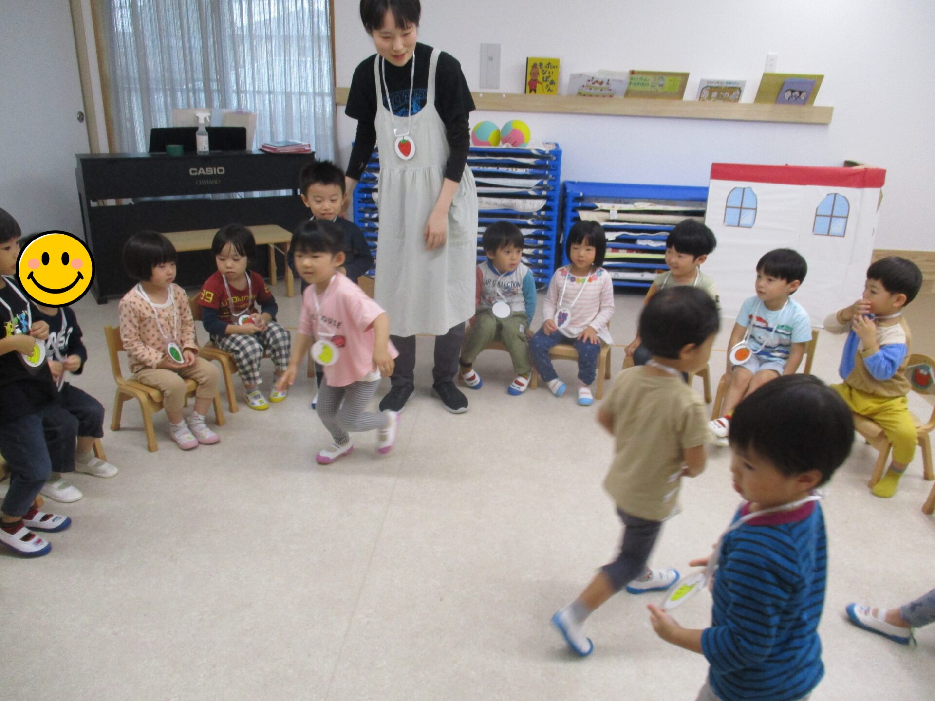 1人1人わかりやすいように果物のカードをかけ、呼ばれたら急いで空いている椅子に移動!!