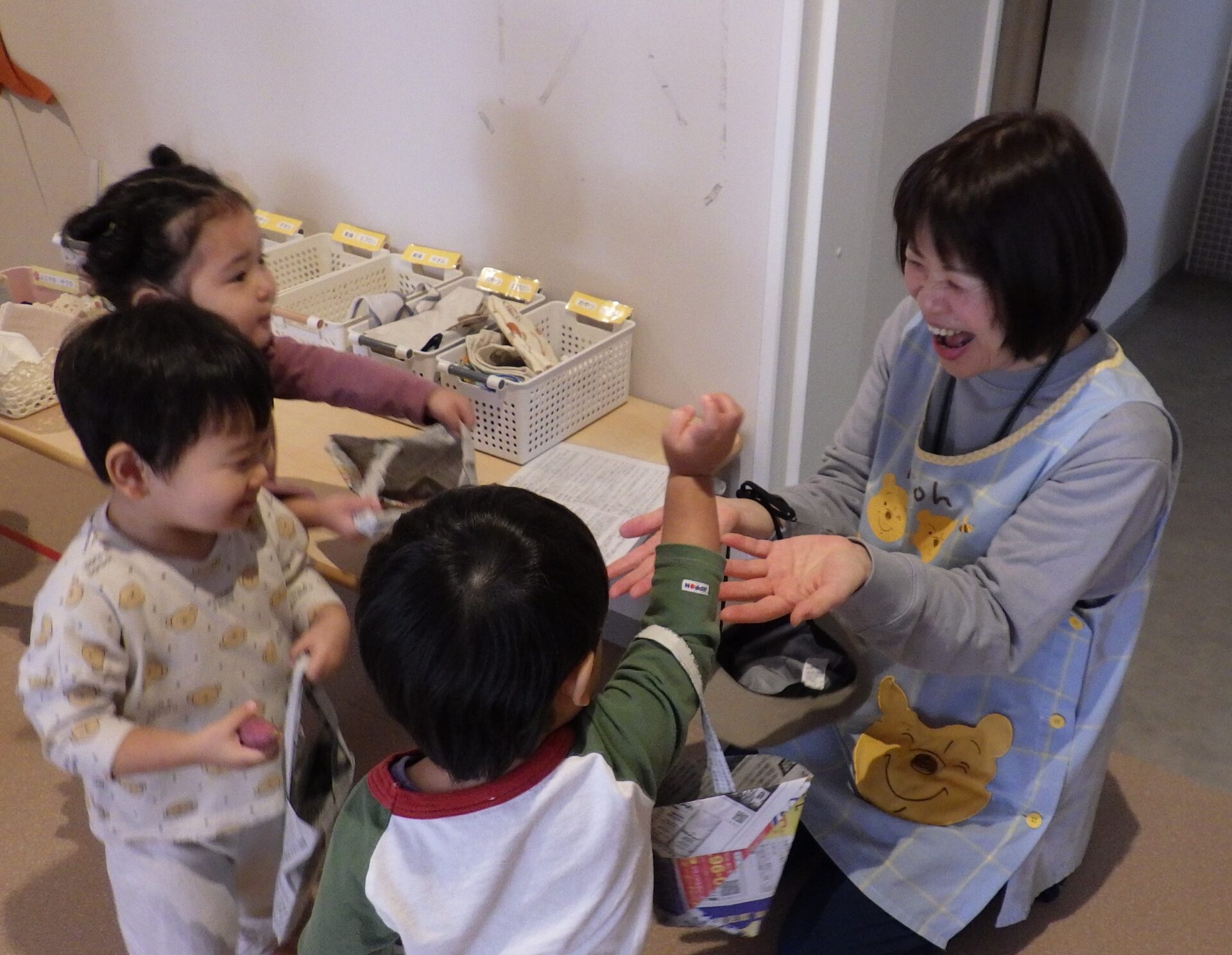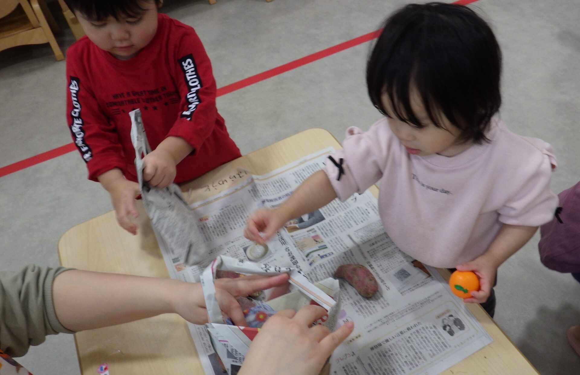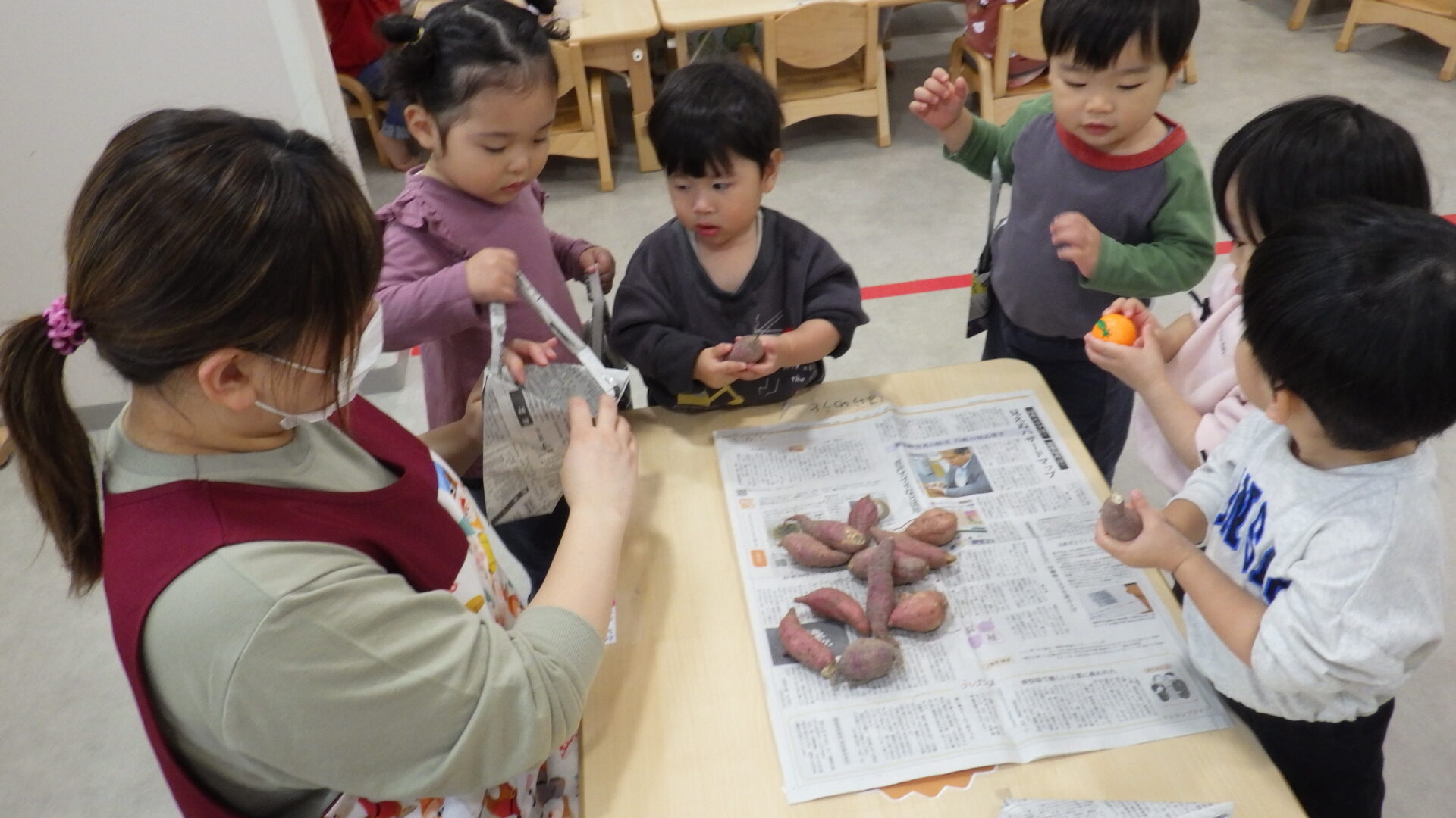保育士が机に芋を広げて待っていると…