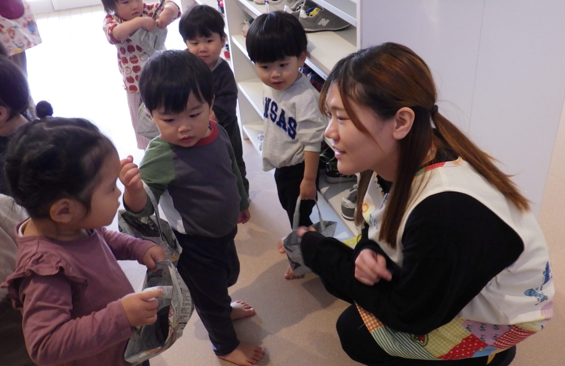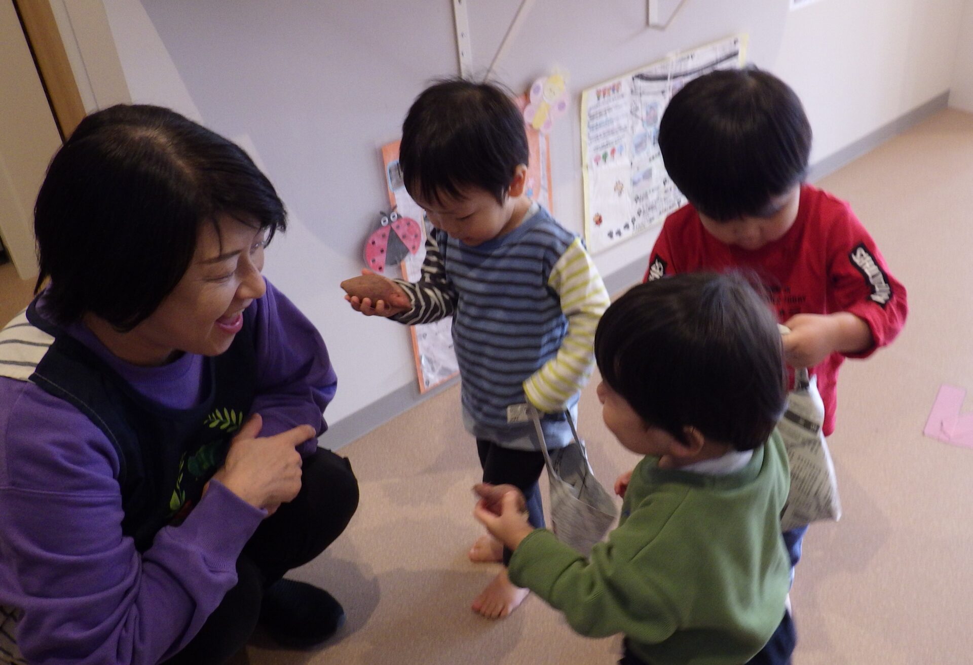 廊下で出会った先生達に、バックに入った芋を見せている子ども達……