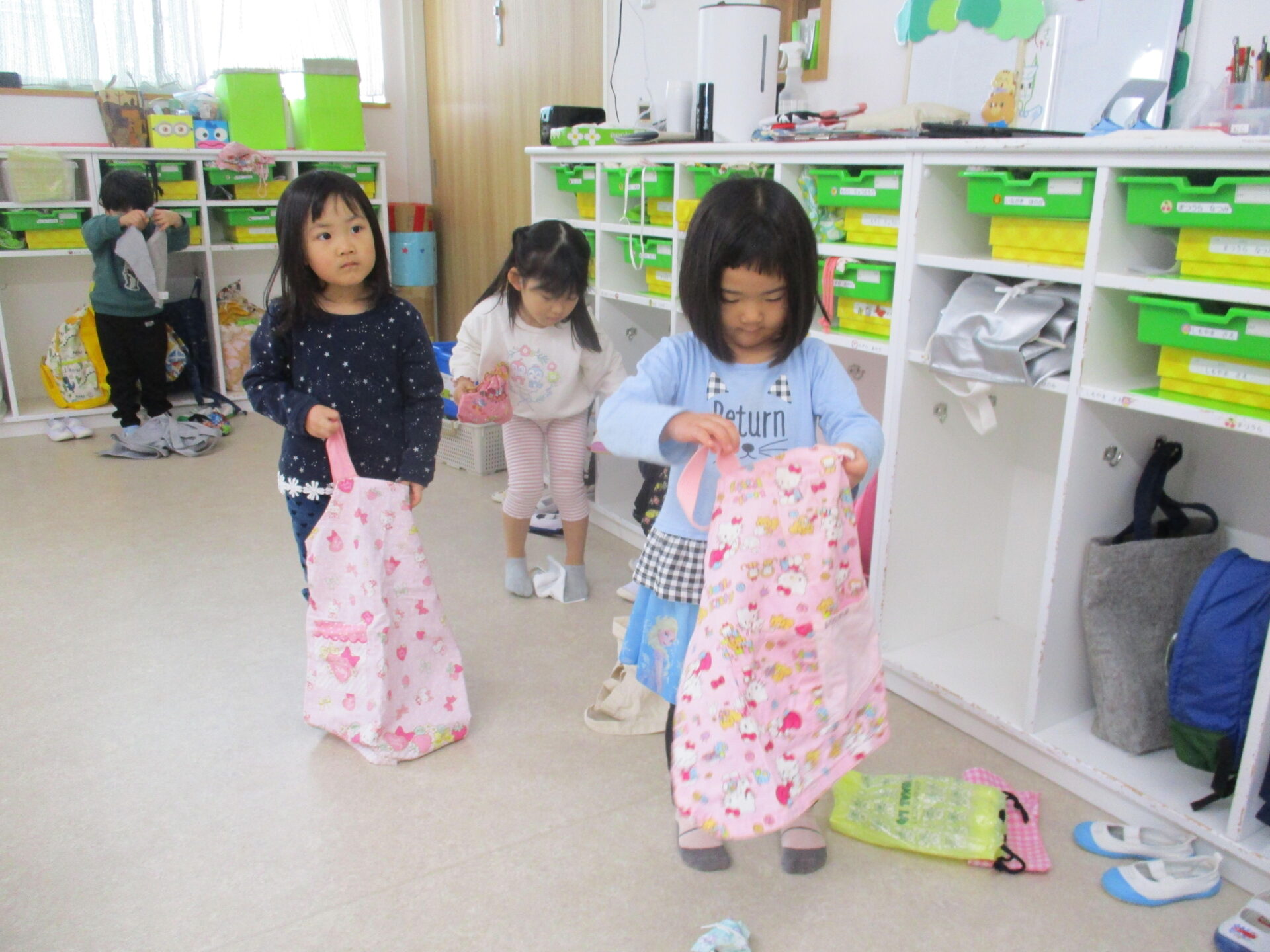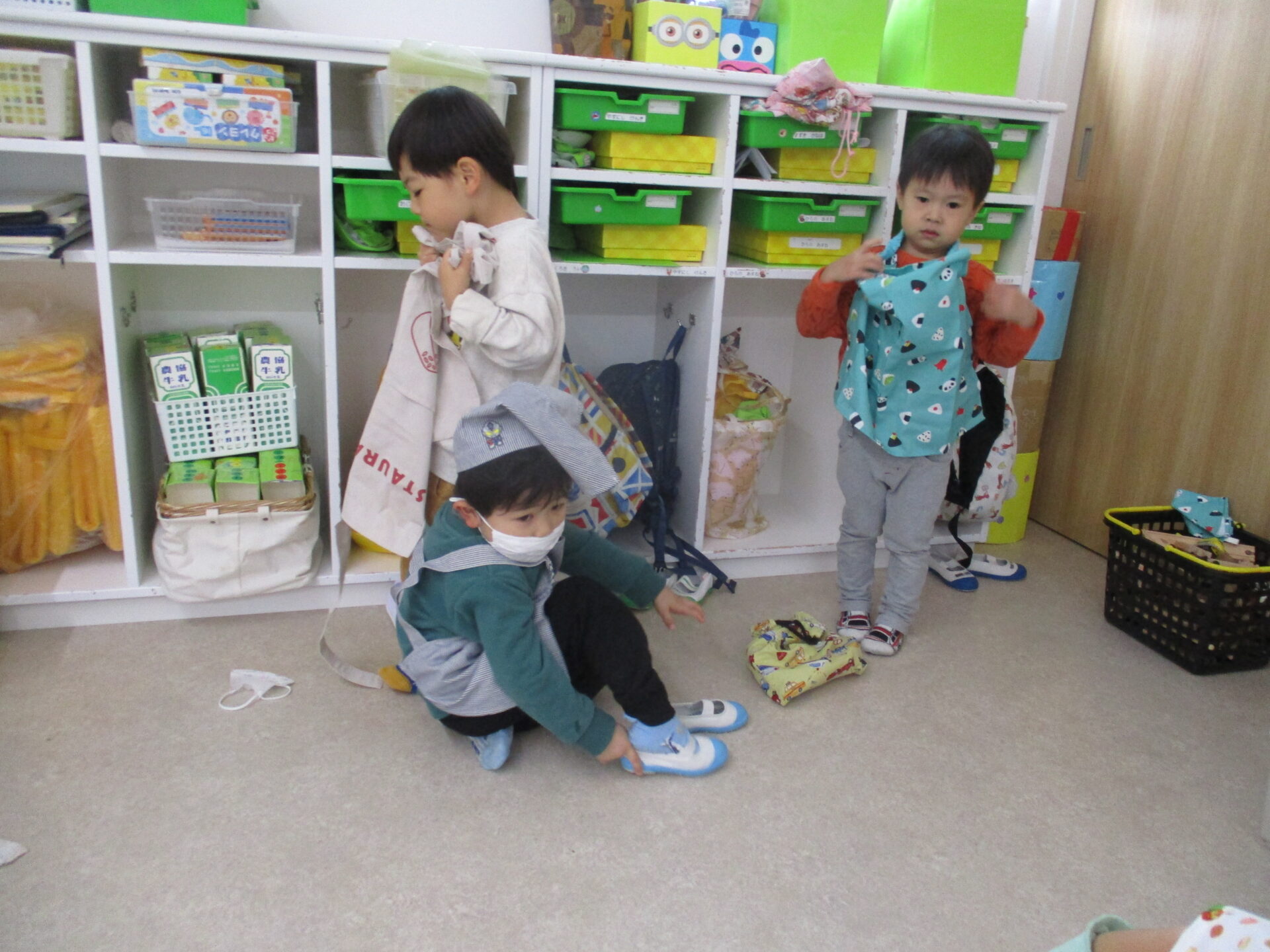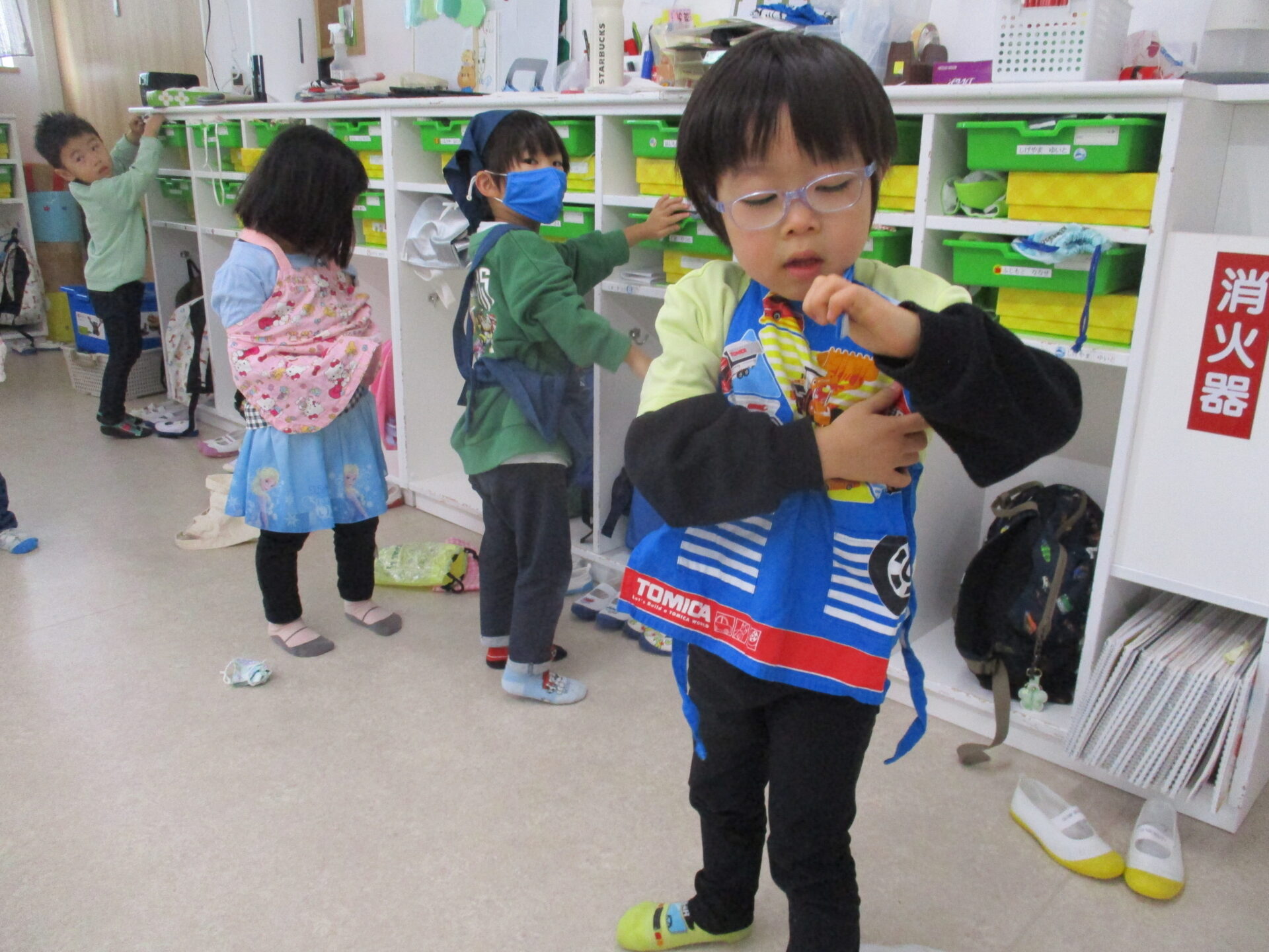 最近のにじ組(3歳児)では、給食の時間にエプロンを使い始めました。