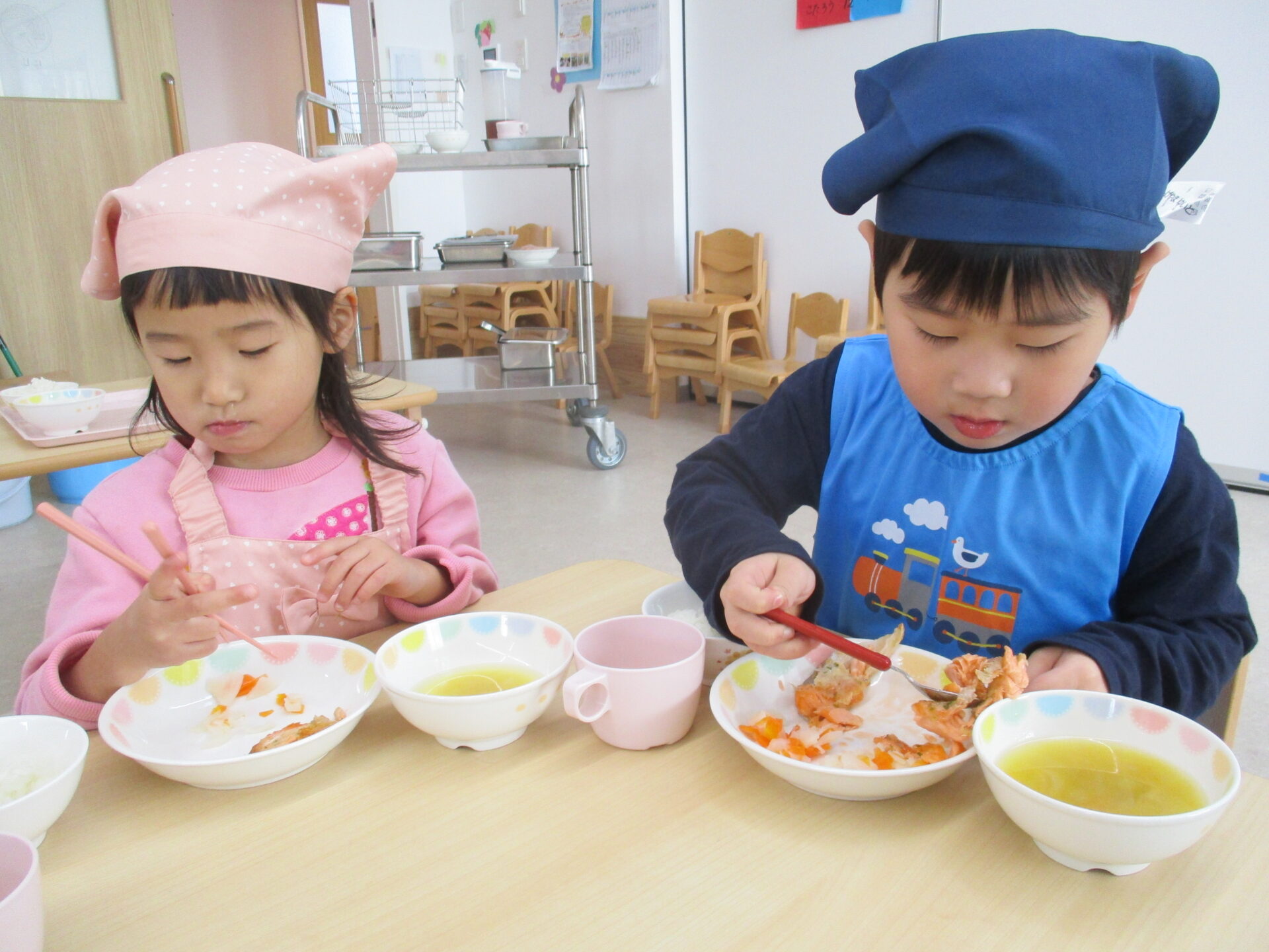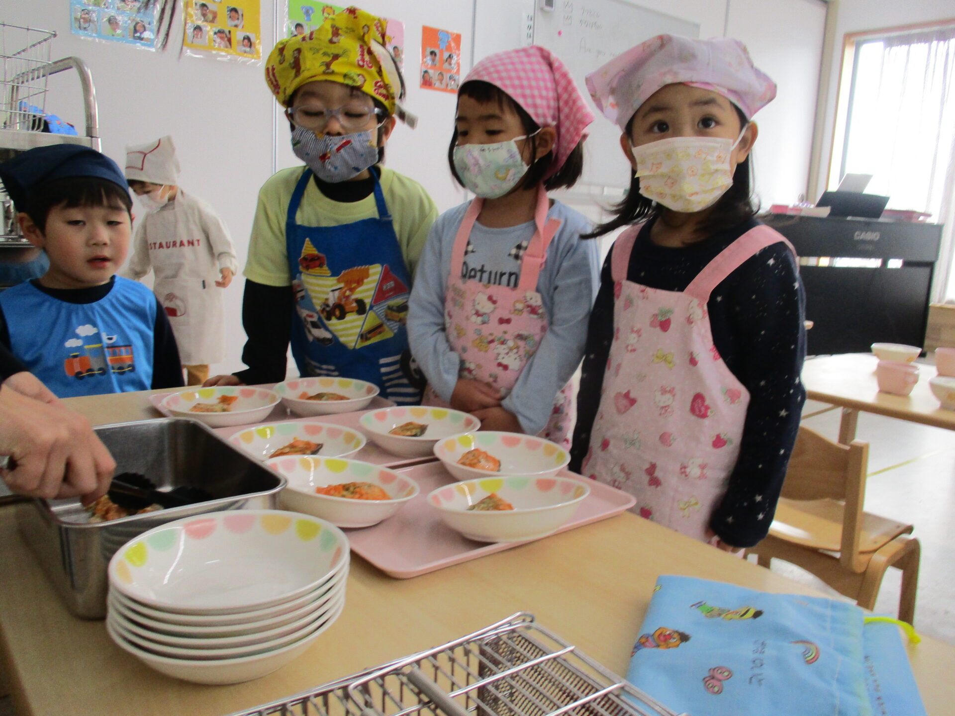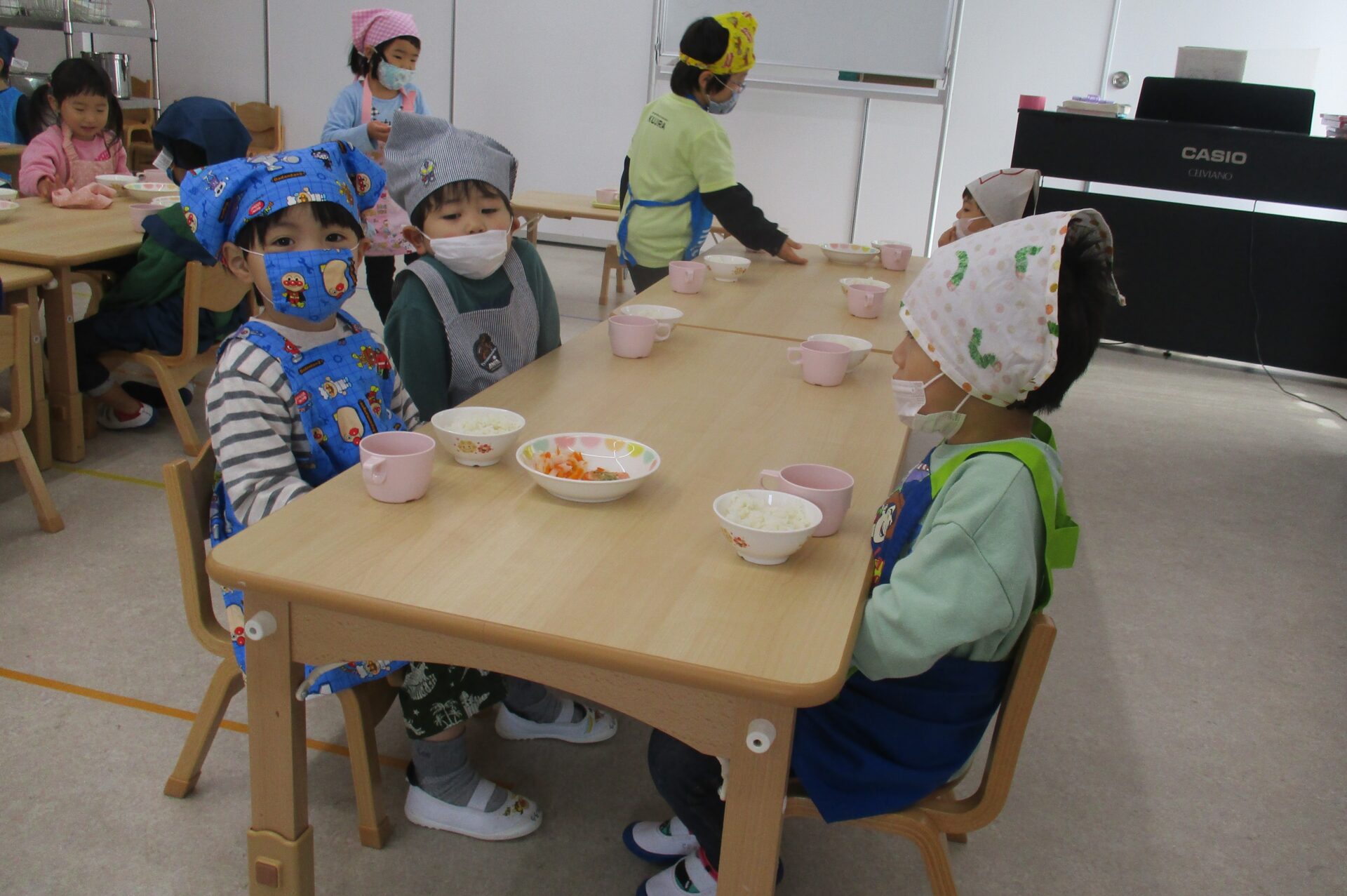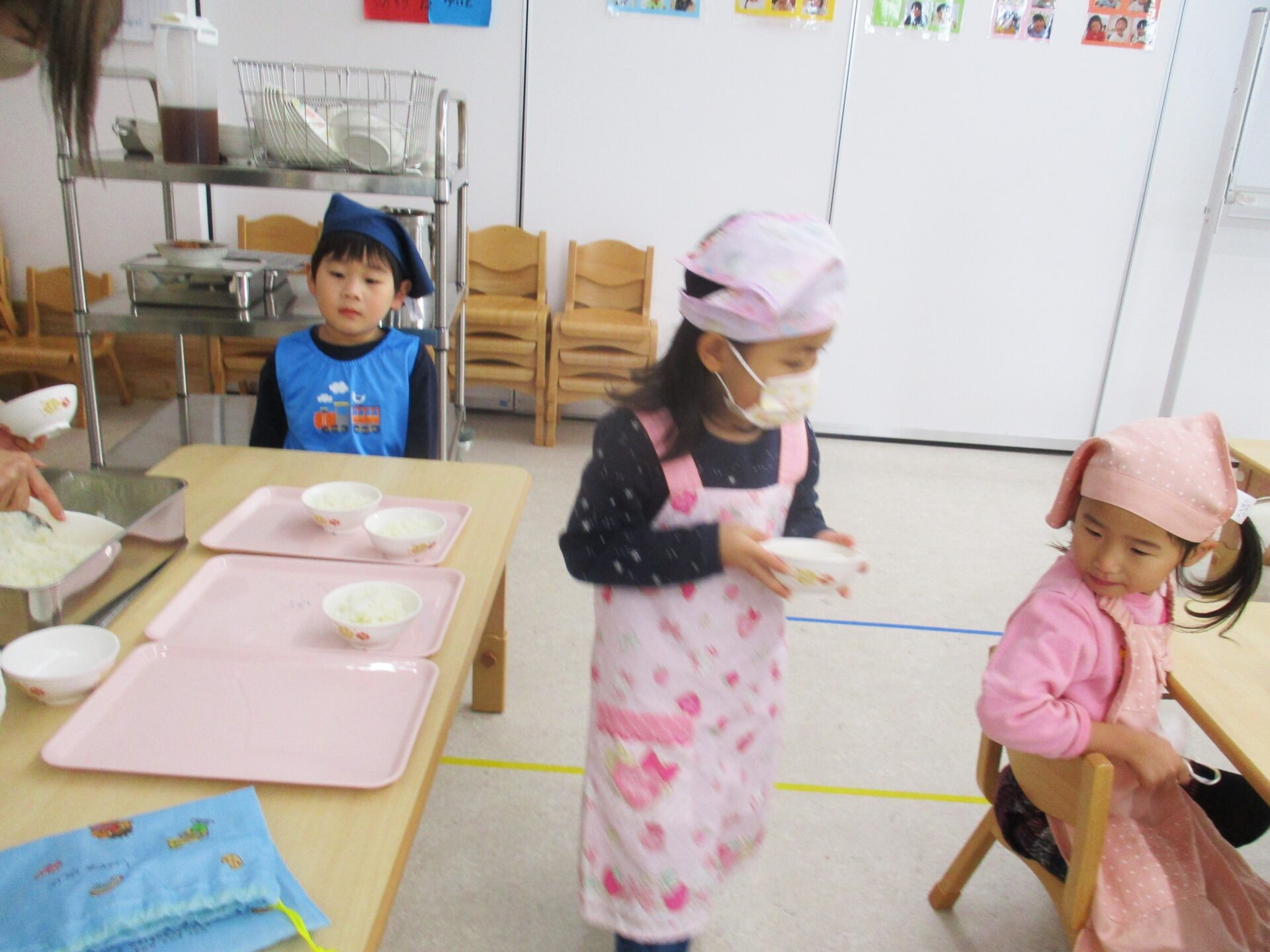 当番の子どもたちは「先生まだかなあ~」と配るお皿を待っているようです。
