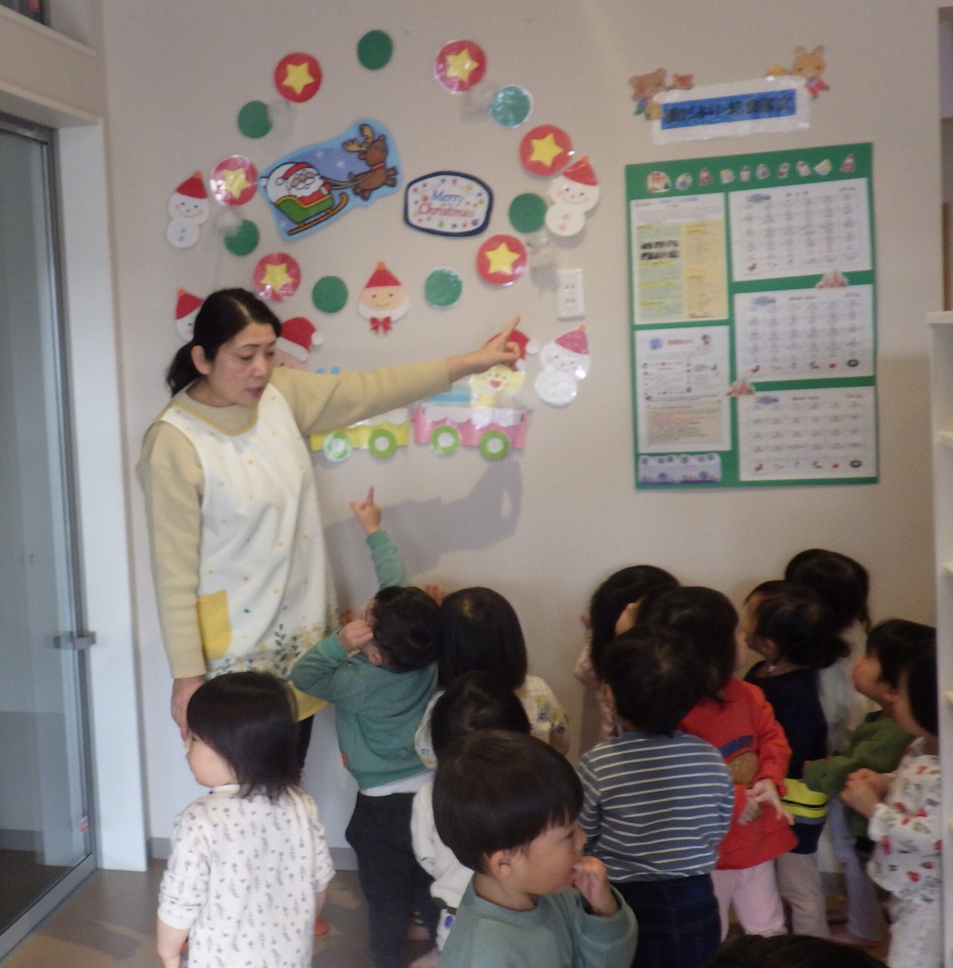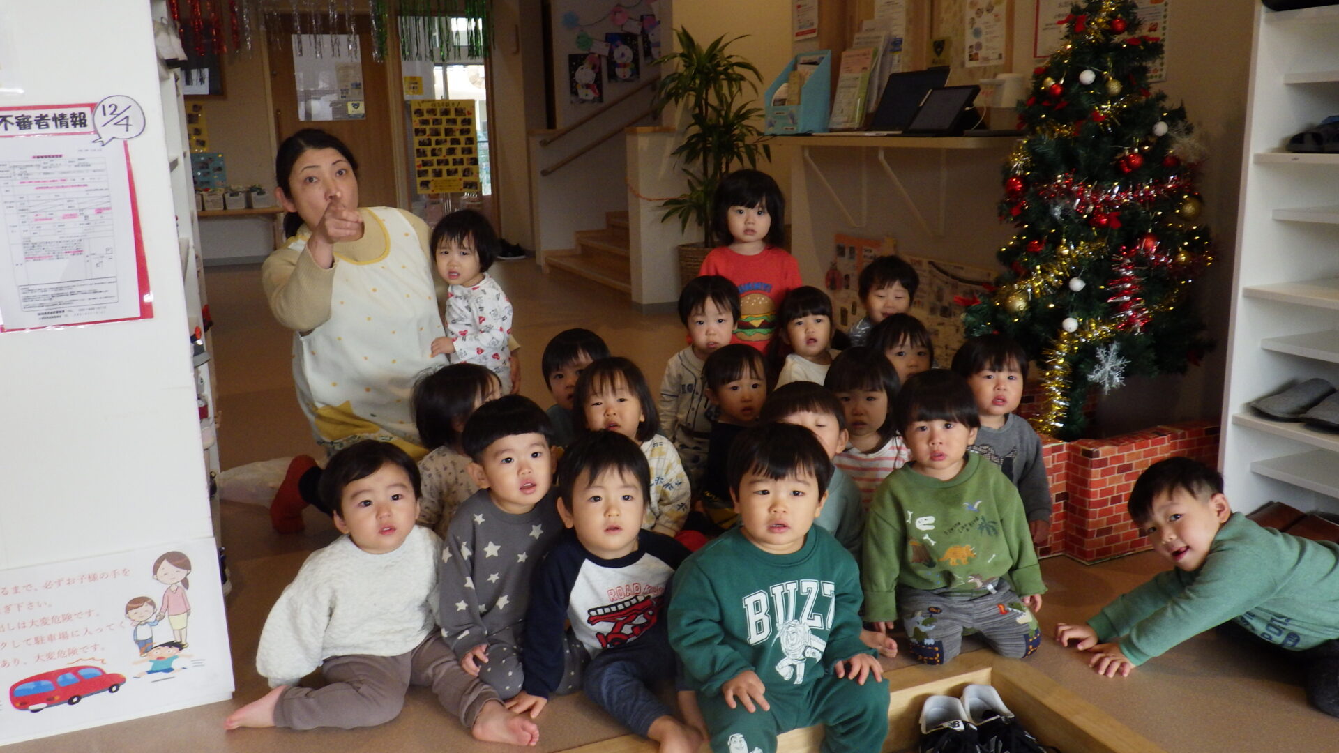 ここで写真を撮ってみようか??とクリスマスツリーの前にやってきた、だいち組(1歳児)