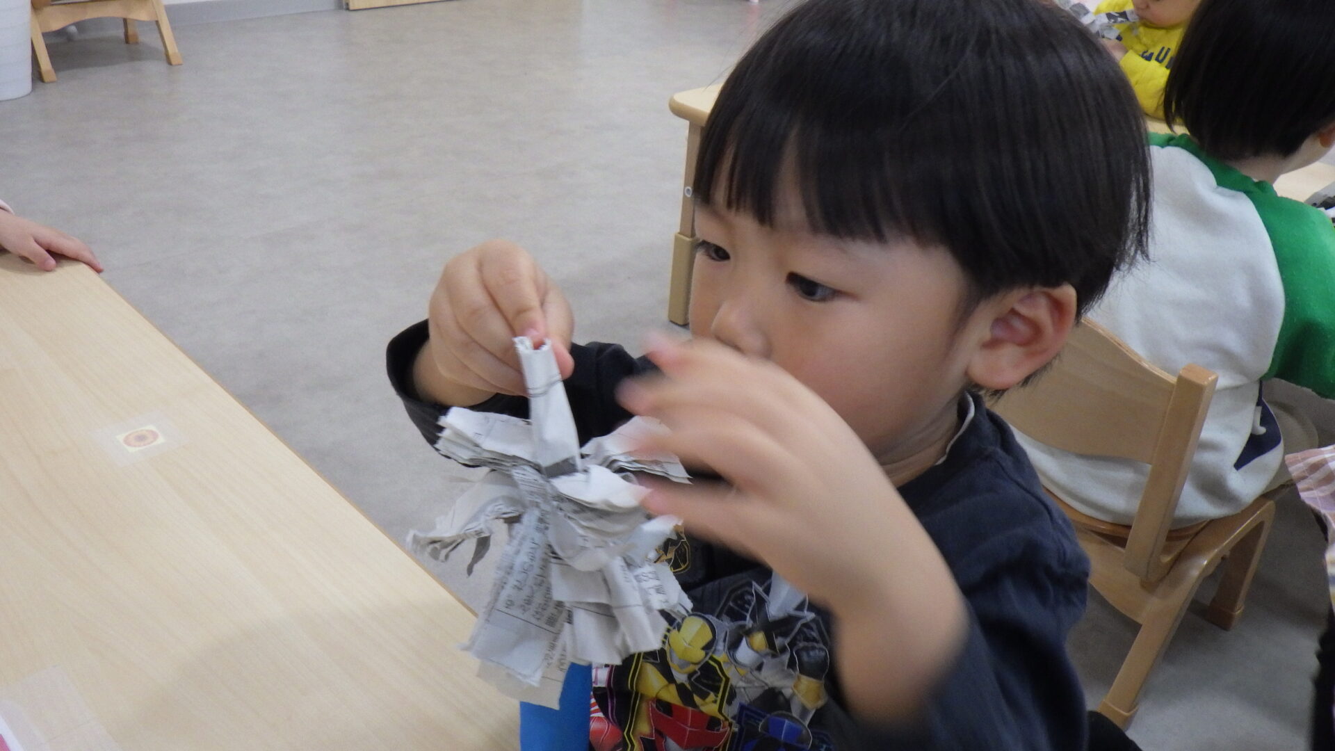 新聞紙を筒状に丸めた物を、指先を使って上から下へさいていきます。
