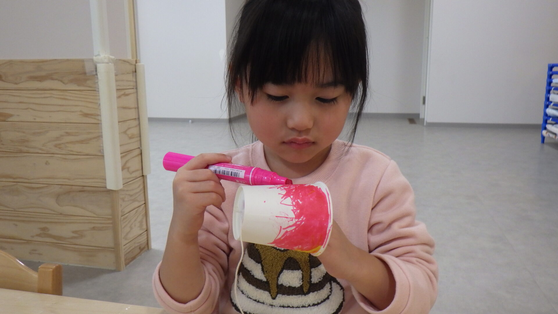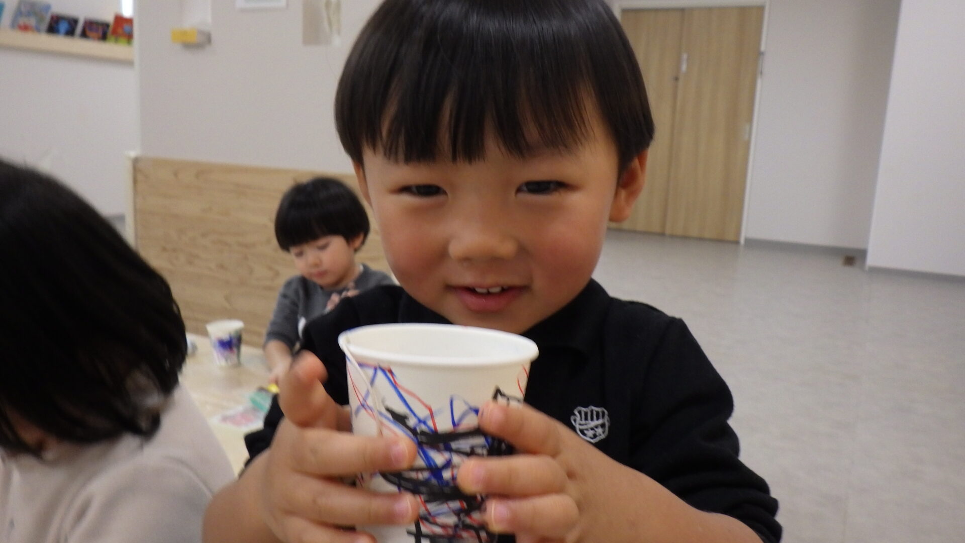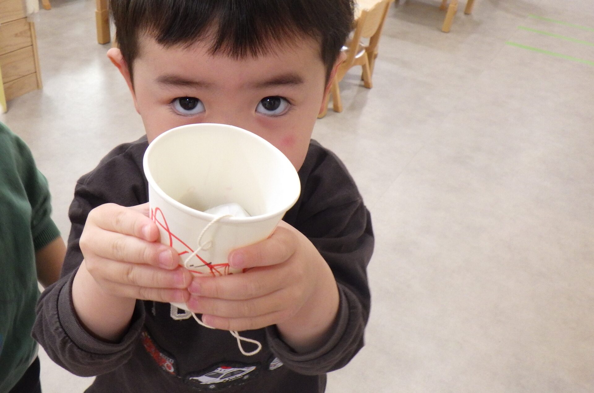 さて、あめ組さんのけん玉は…紙コップと新聞紙を使って作りました。