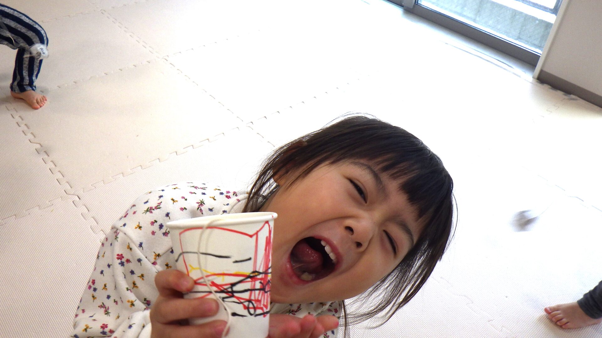 『自分だけのオリジナルけん玉』が出来たことに大喜びの子どもたち。今日持ち帰るので、是非、お家で一緒に遊んでみてくださいね(^o^)