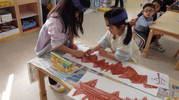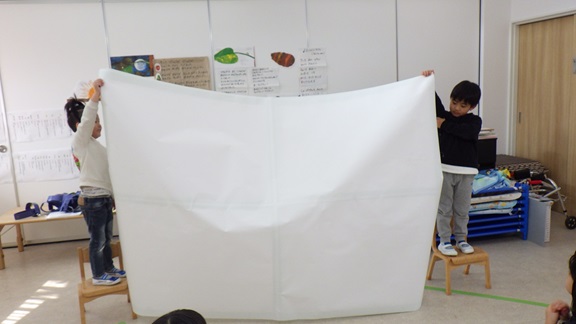 今日は、劇に使う背景の製作に挑戦しました!