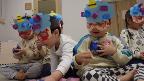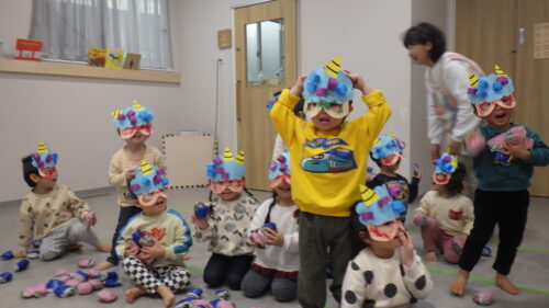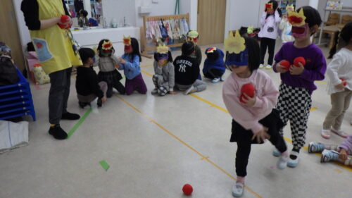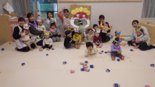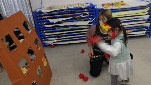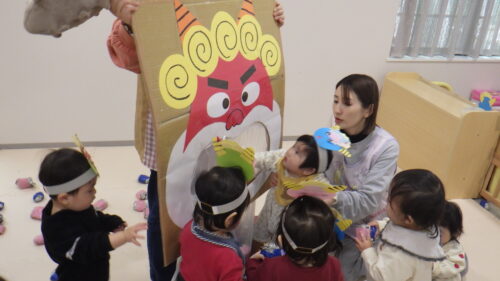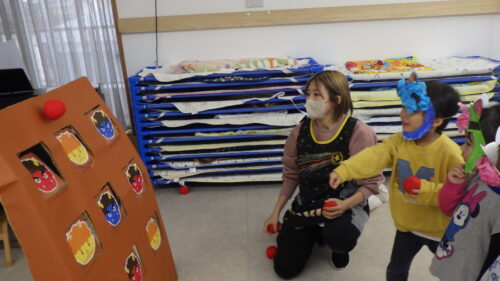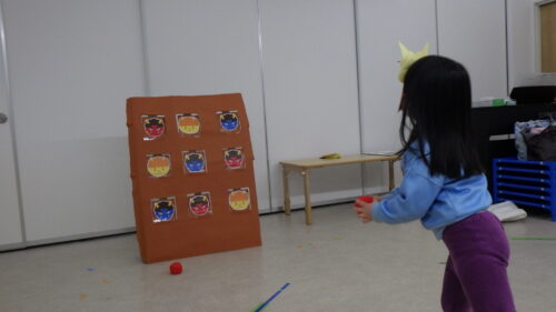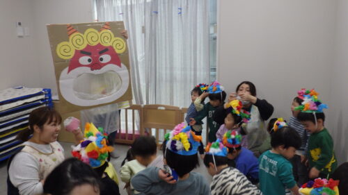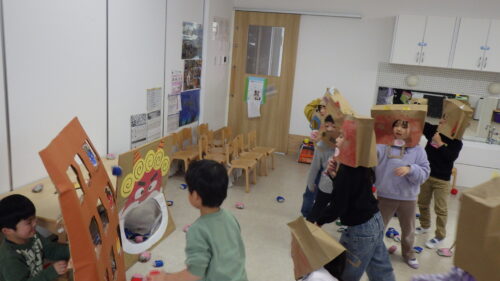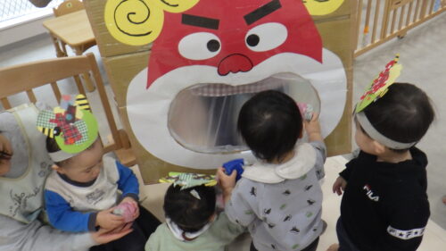 鬼さんの大きなお口をめがけて、豆を投げて鬼退治です。