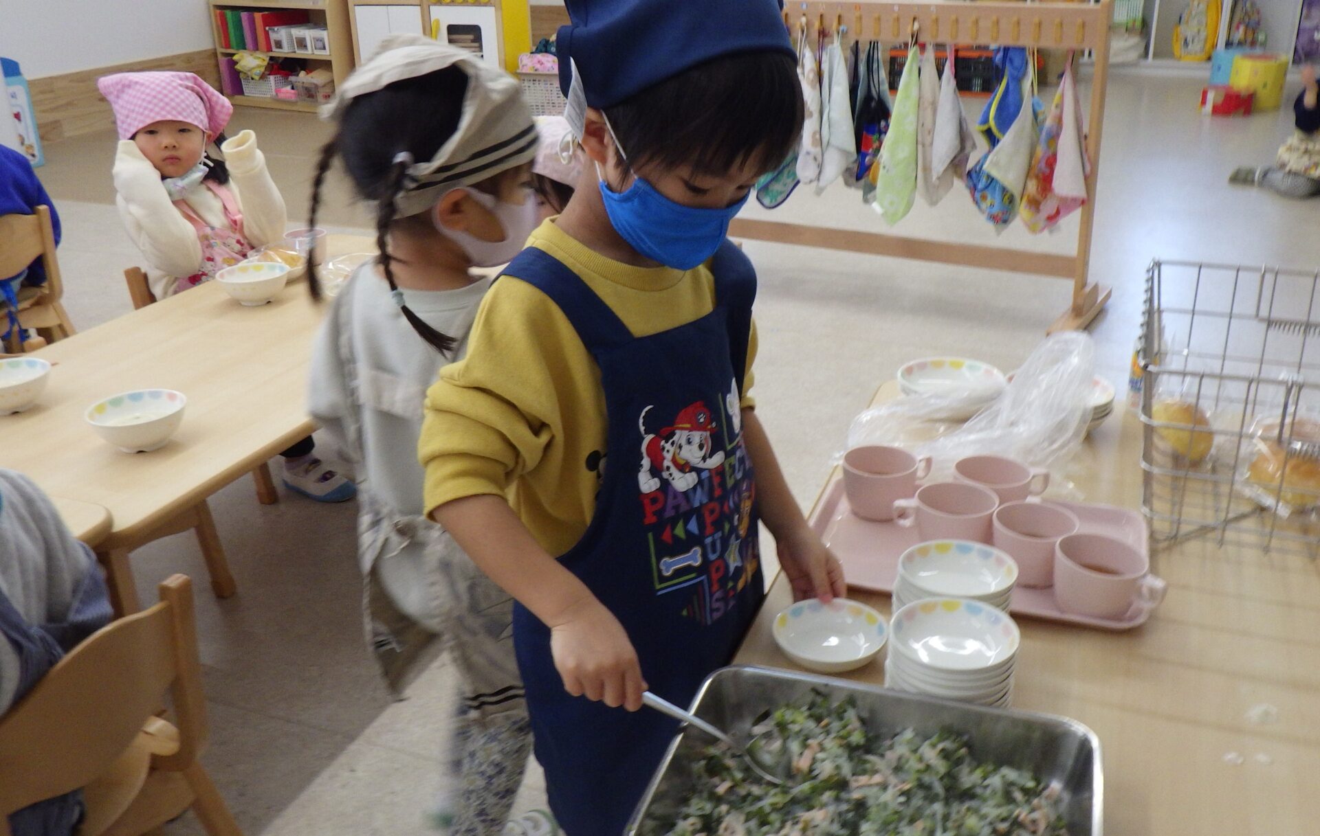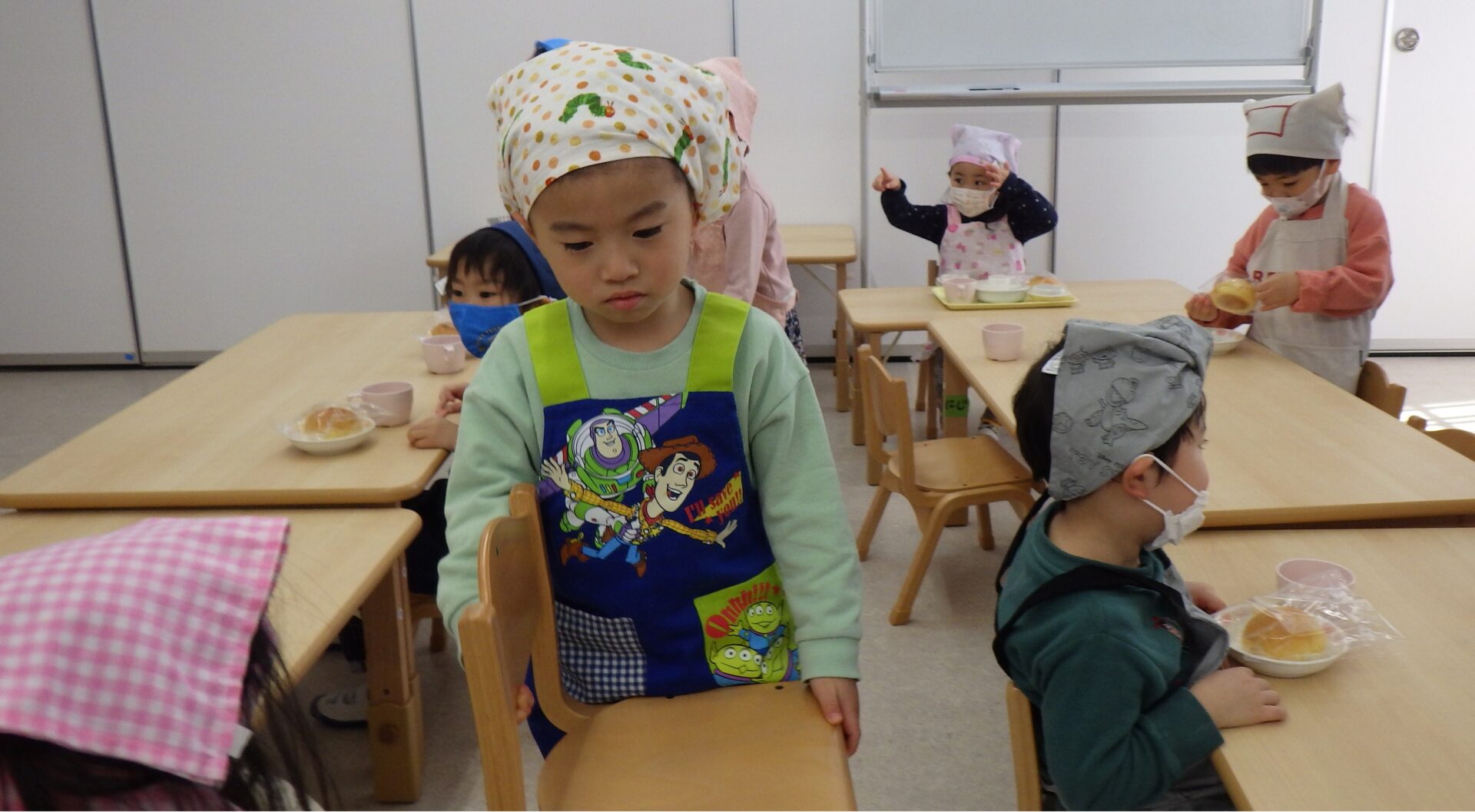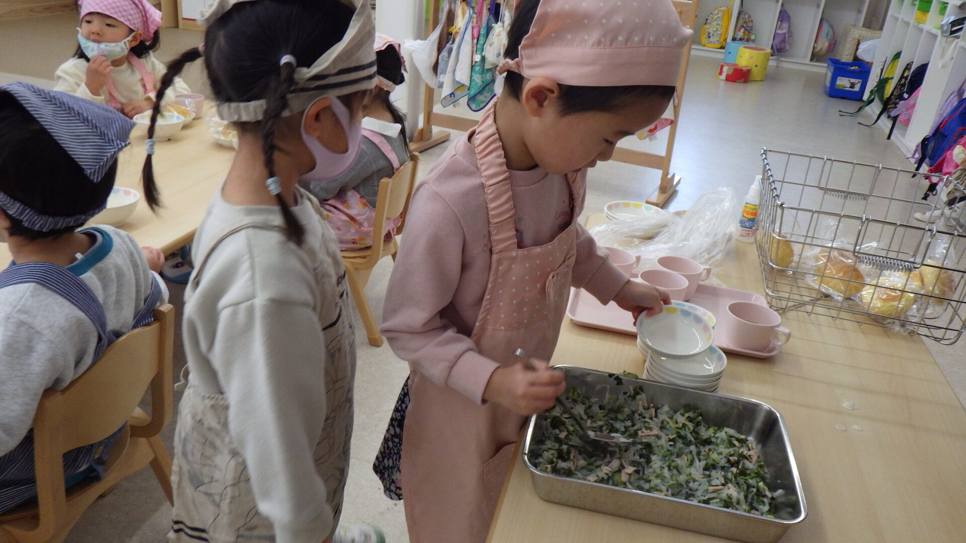 にじ組(3歳児)では、今週から給食の時間に子どもたちが自分でお皿に給食をよそって、配膳を始めました。その様子を少し見てみましょう♪