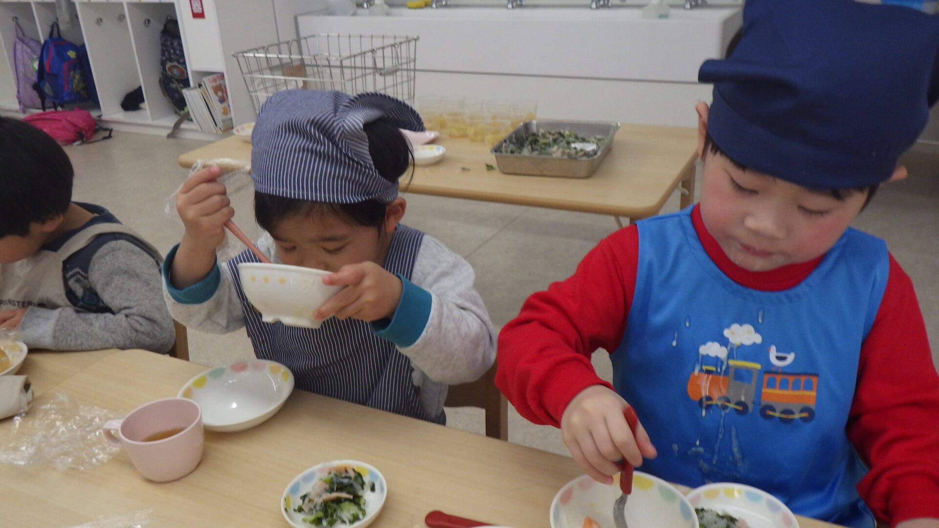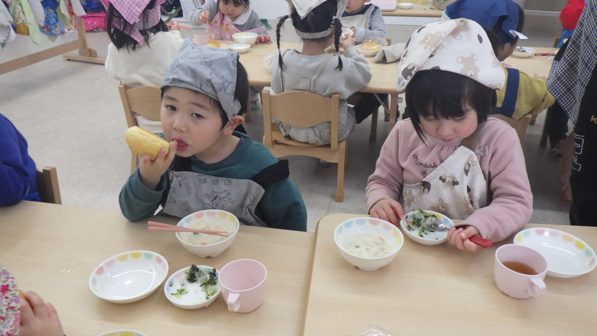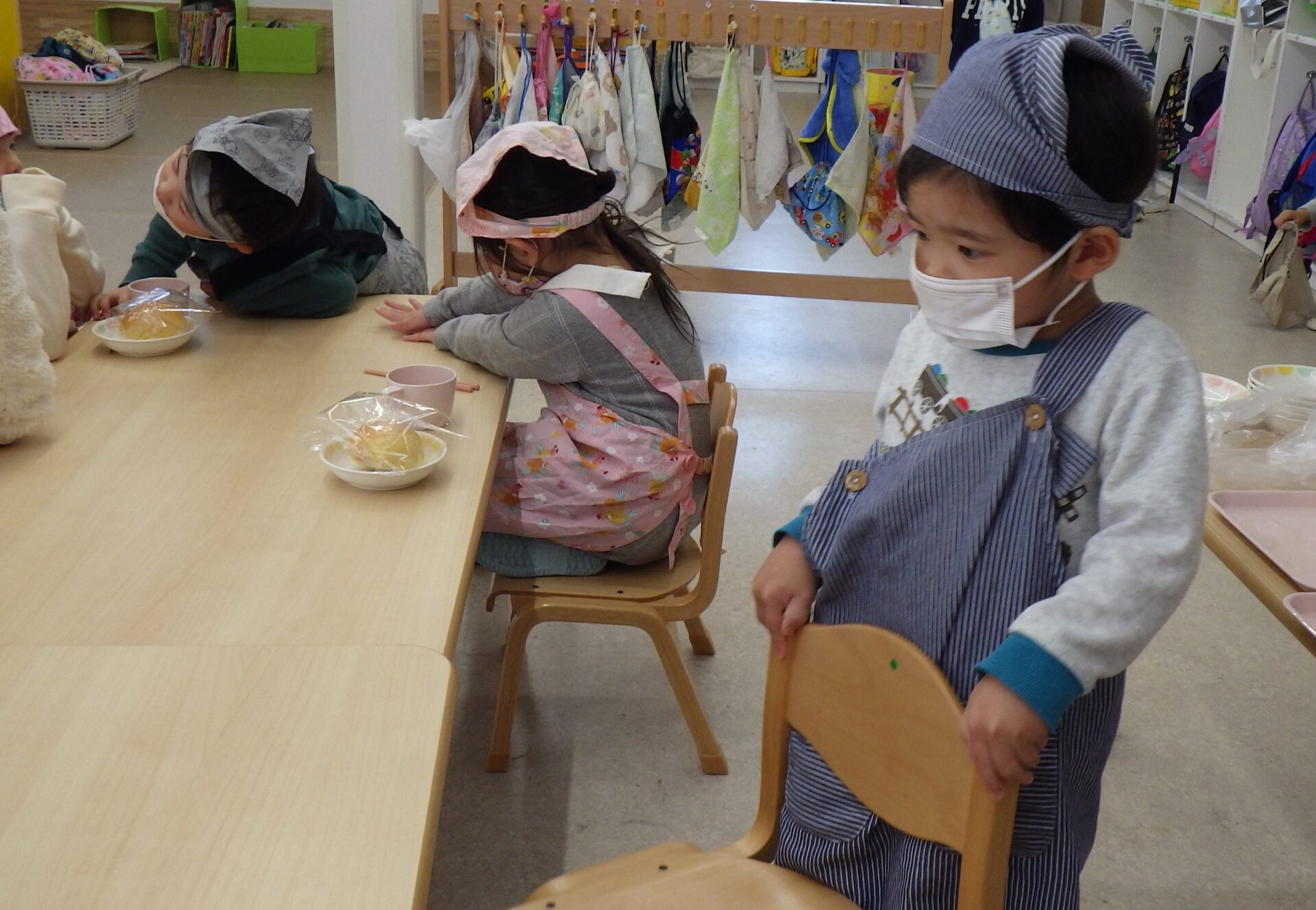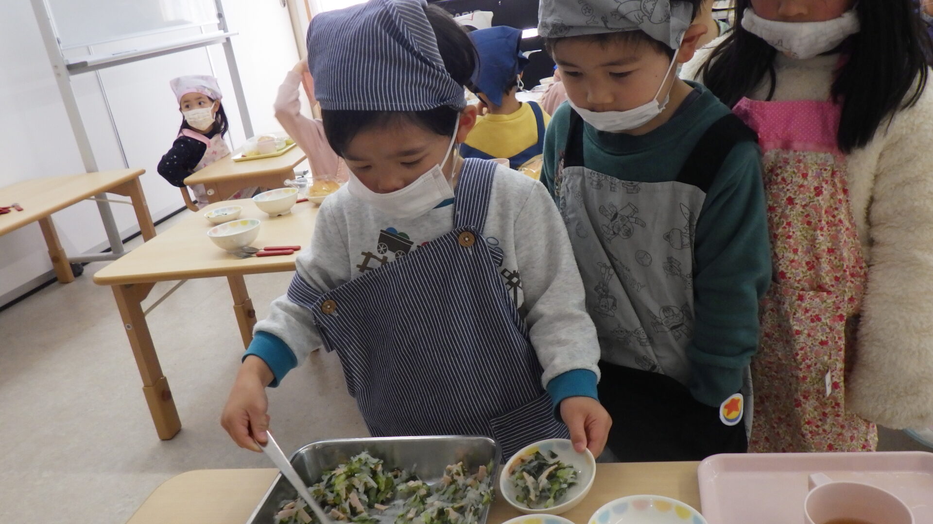 にじ組(3歳児)では、今週から給食の時間に子どもたちが自分でお皿に給食をよそって、配膳を始めました。その様子を少し見てみましょう♪
