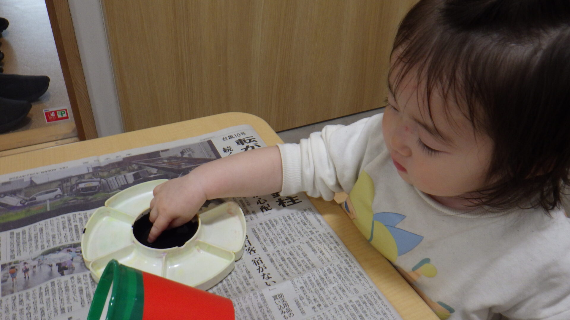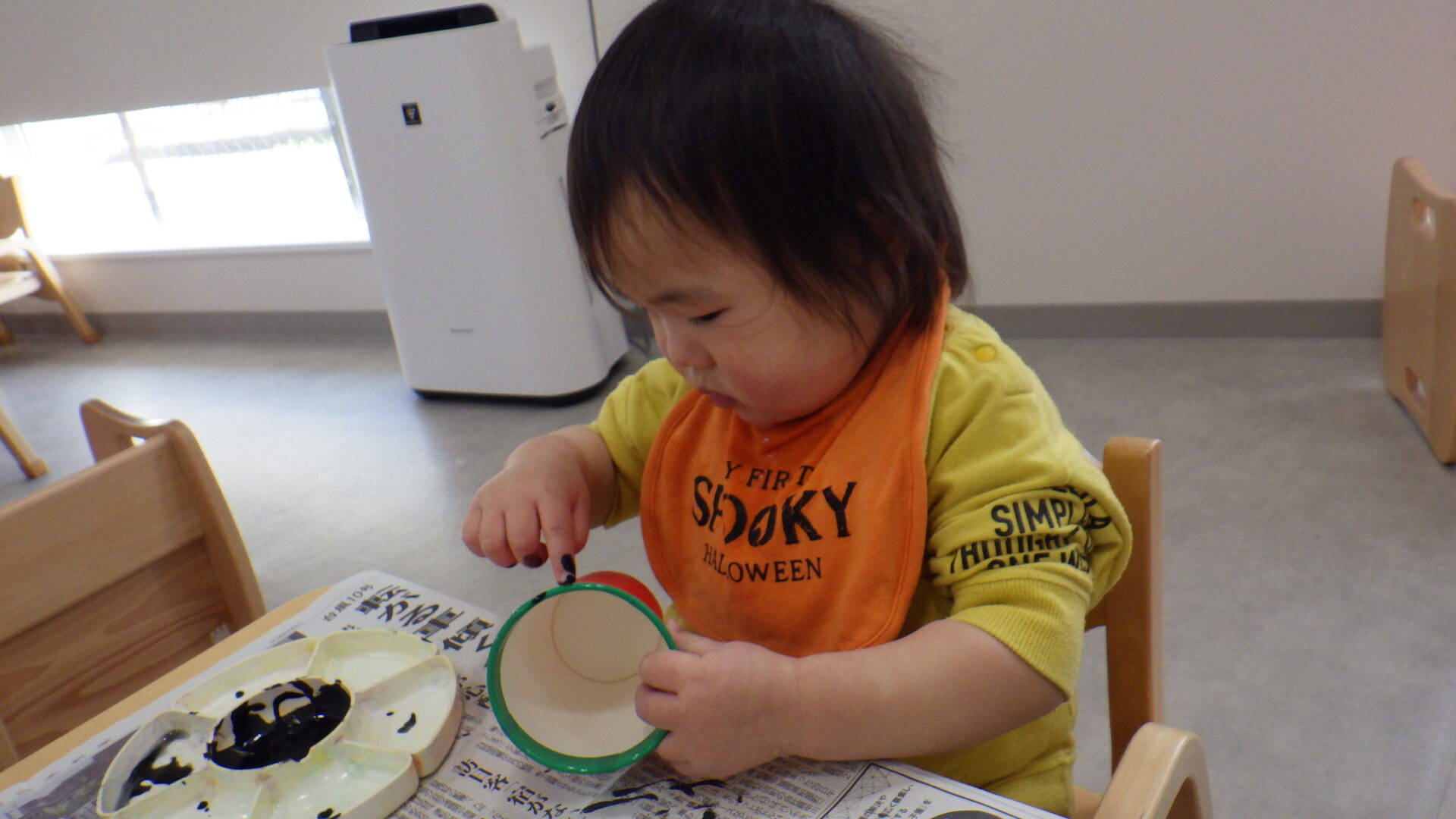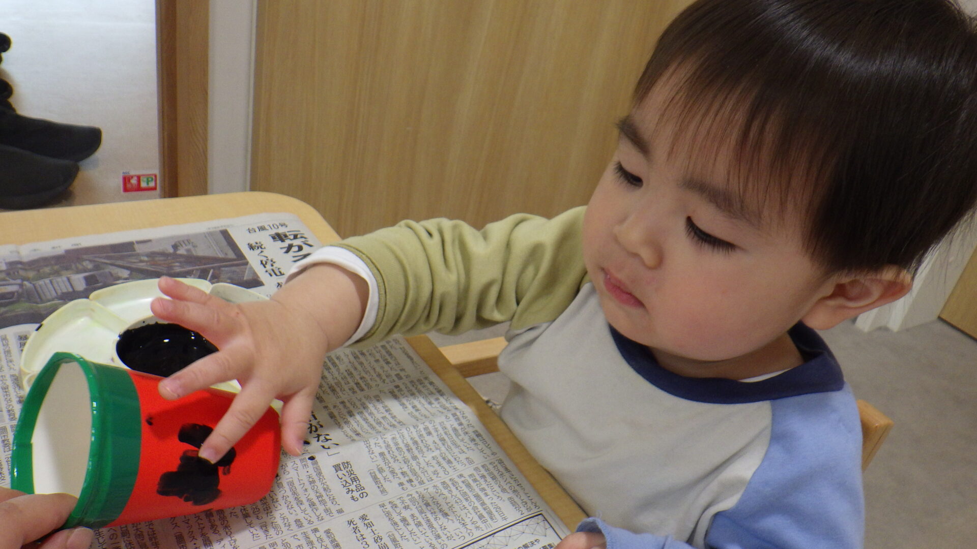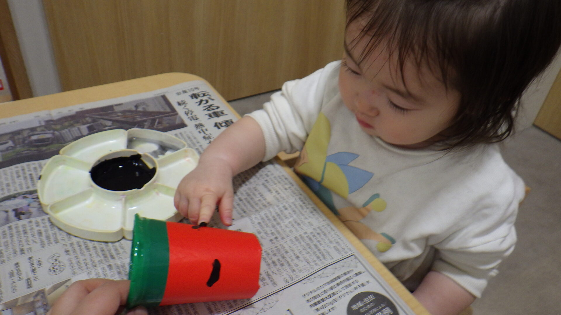 ちょんちょんっと指先に絵の具を付けて、、、