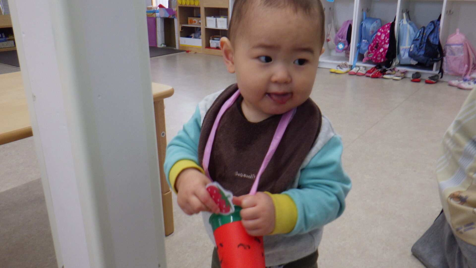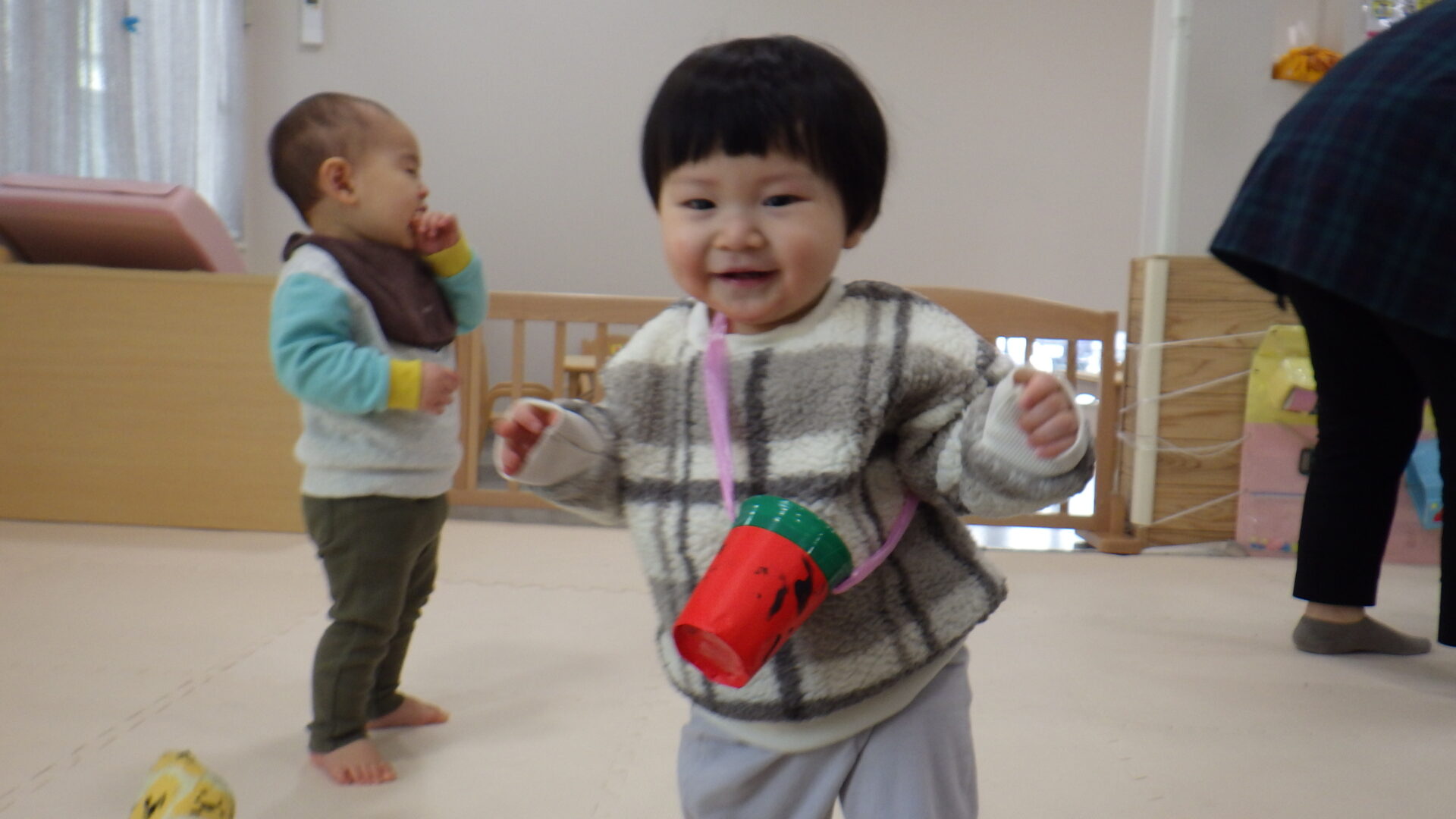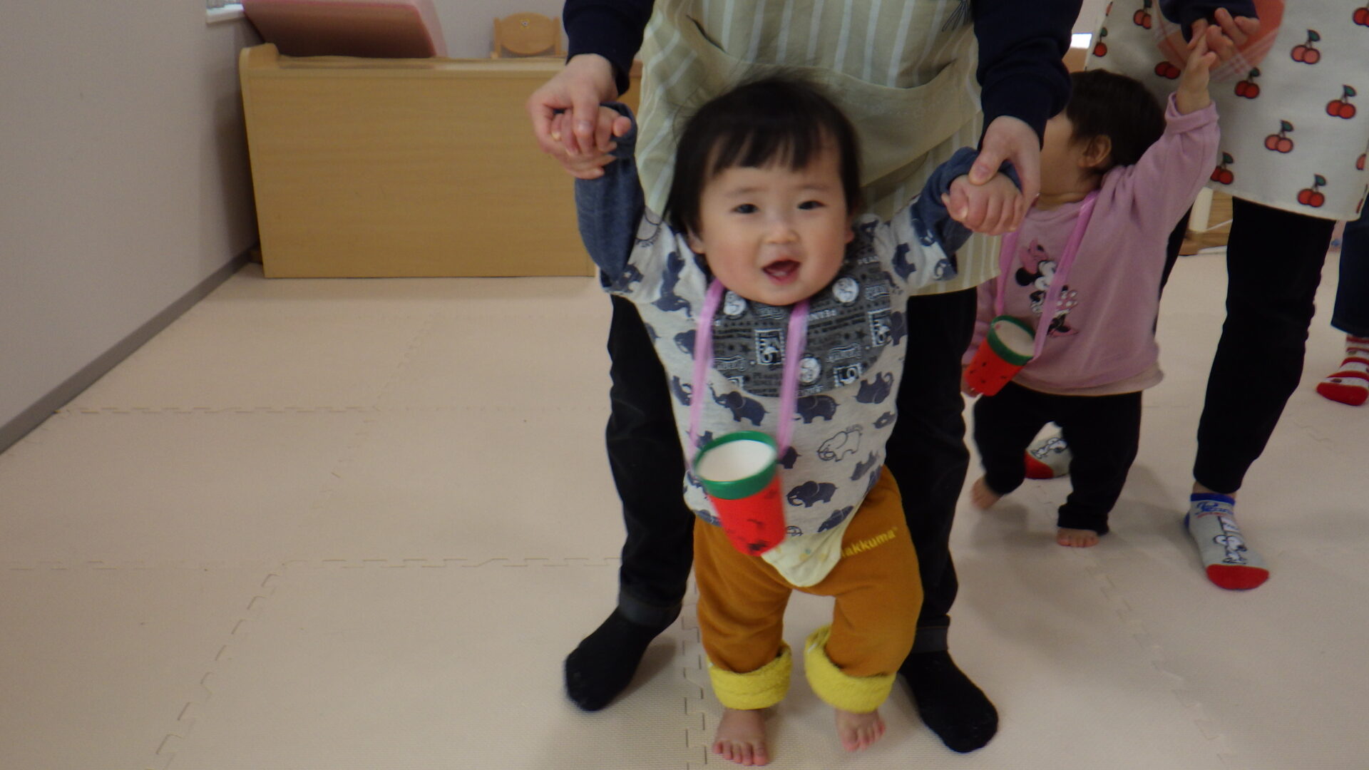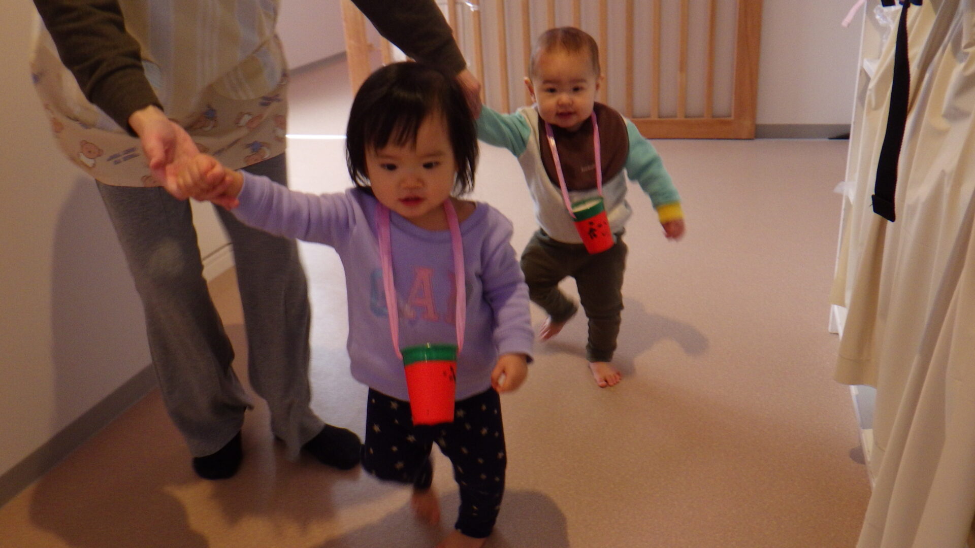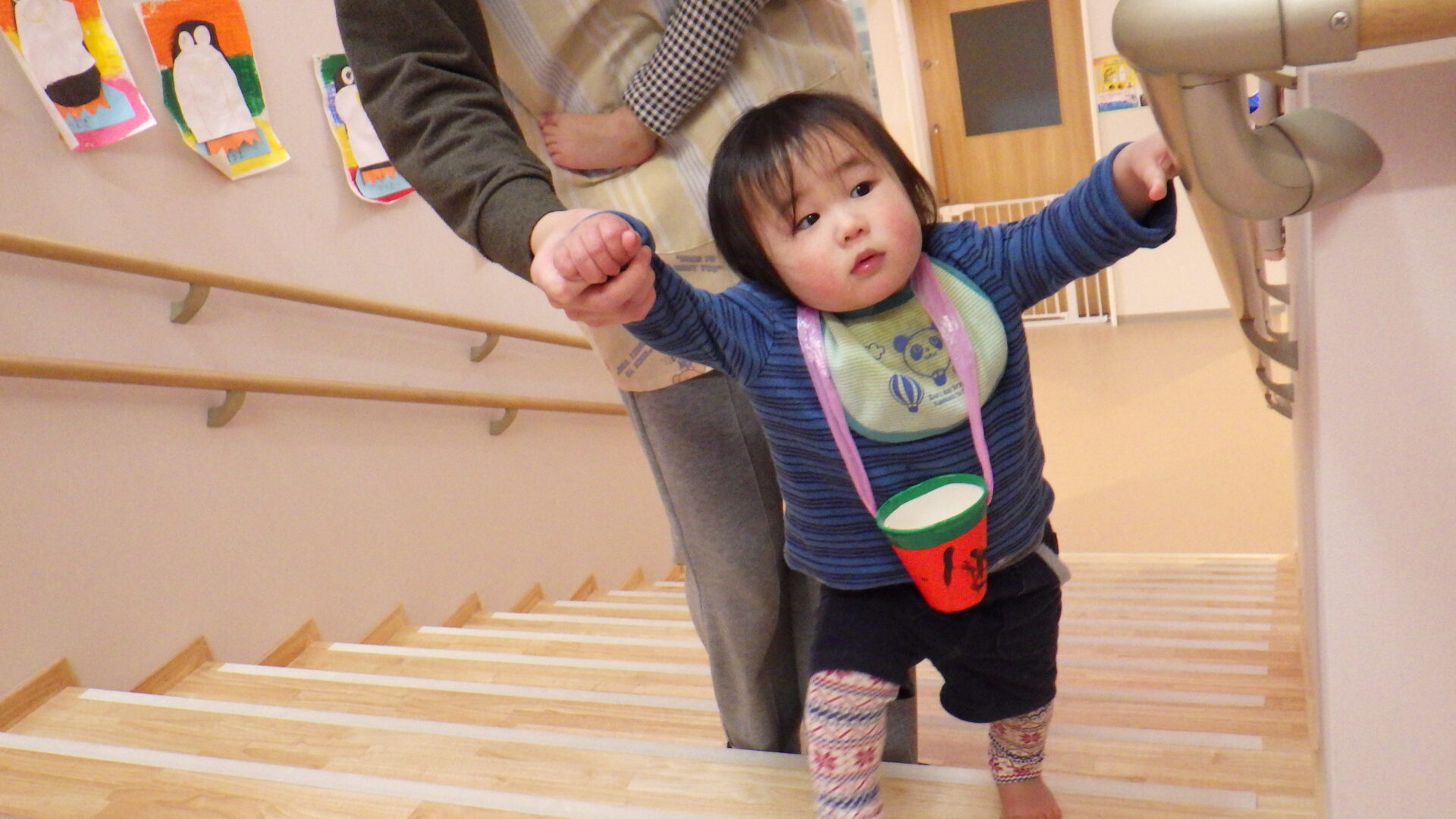 保育士と手をつないだり、手すりを持ったりと上手に移動しています✨