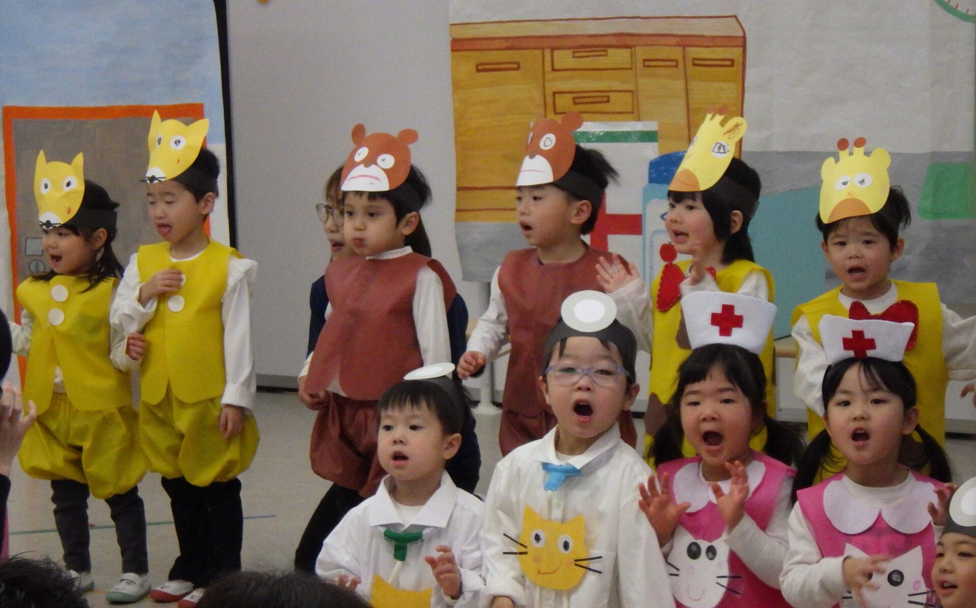 にじ組は、「ねこのおいしゃさん」を演じました。元気いっぱいセリフを言ったり、歌ったりして楽しんでいました。