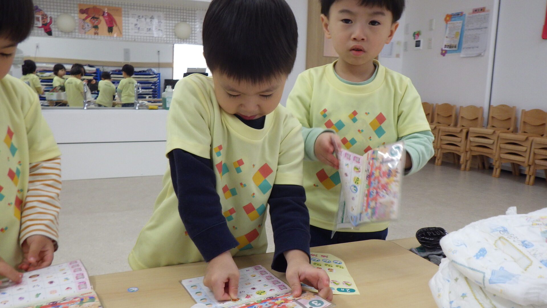 シール帳に出欠のシールを貼ります。