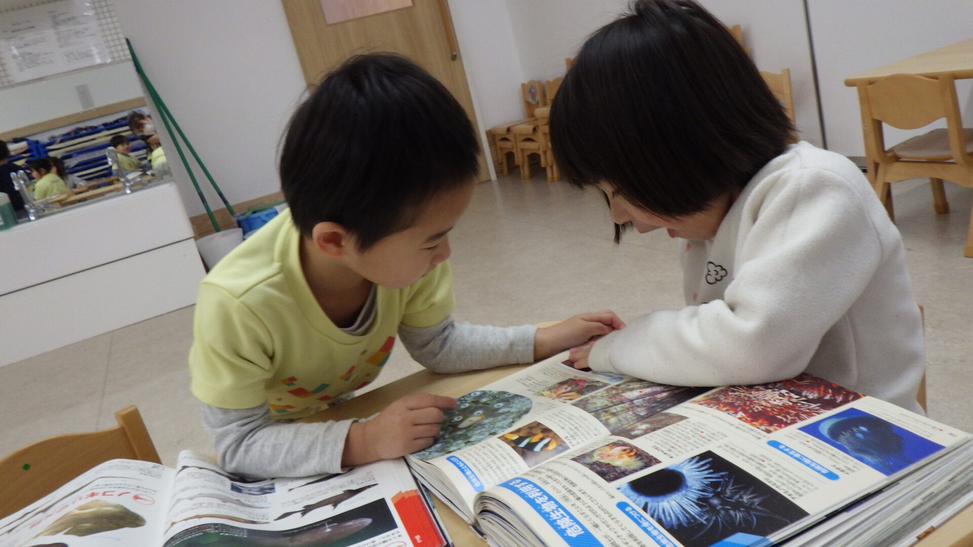そして、こちらでは好きな図鑑を持って来て一緒に見ているようです。
