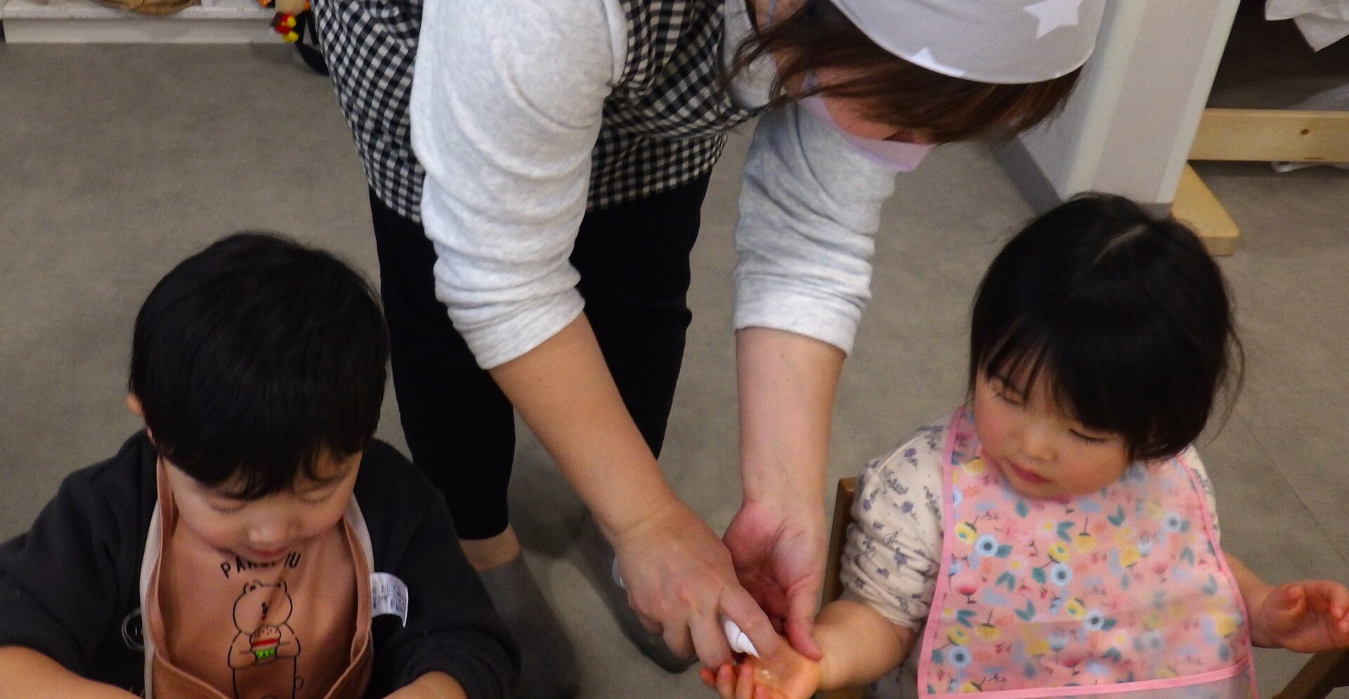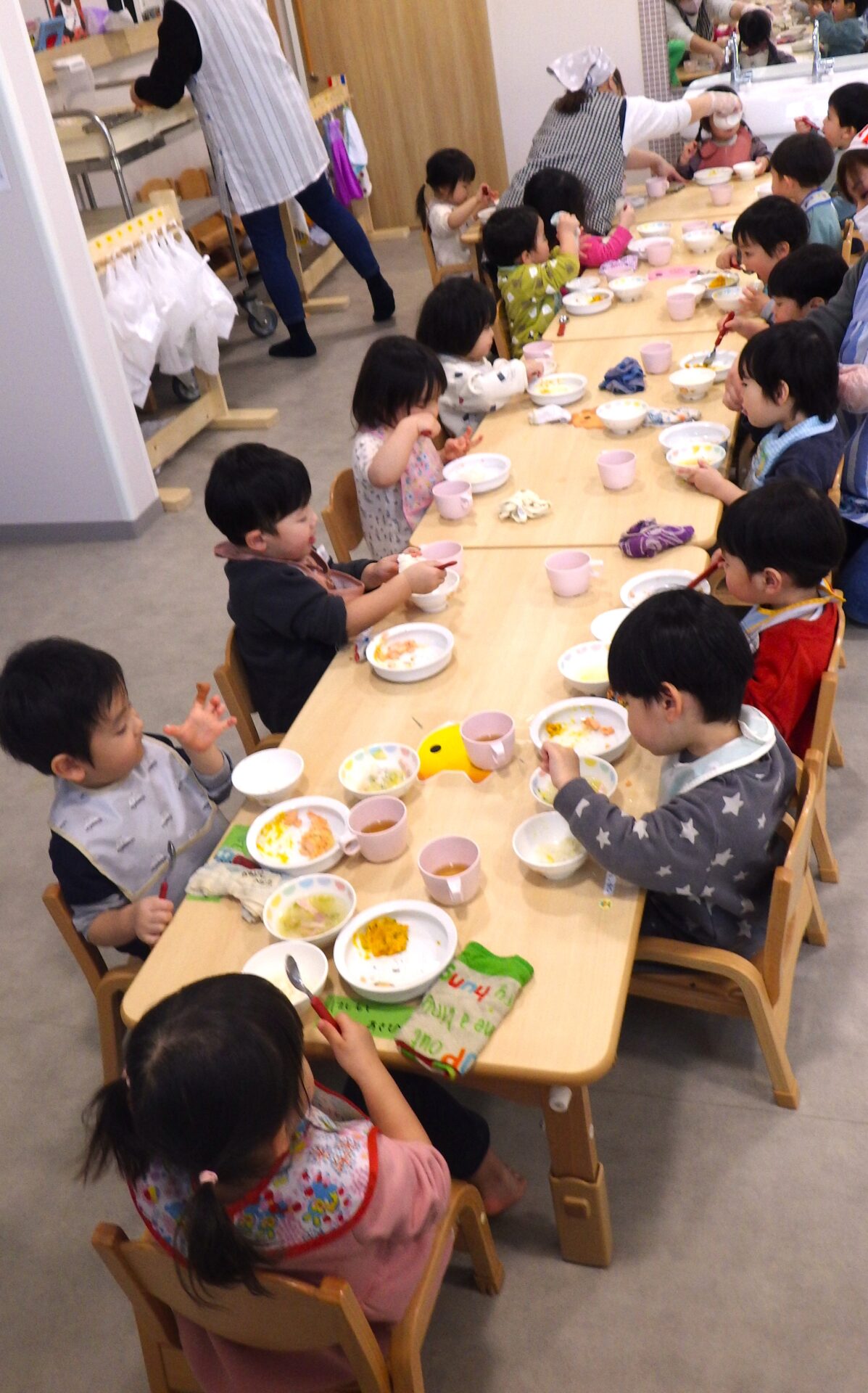 給食の前には、自分で服の袖をまくり、上手に手を洗い、自分のタオルで手を拭き、
