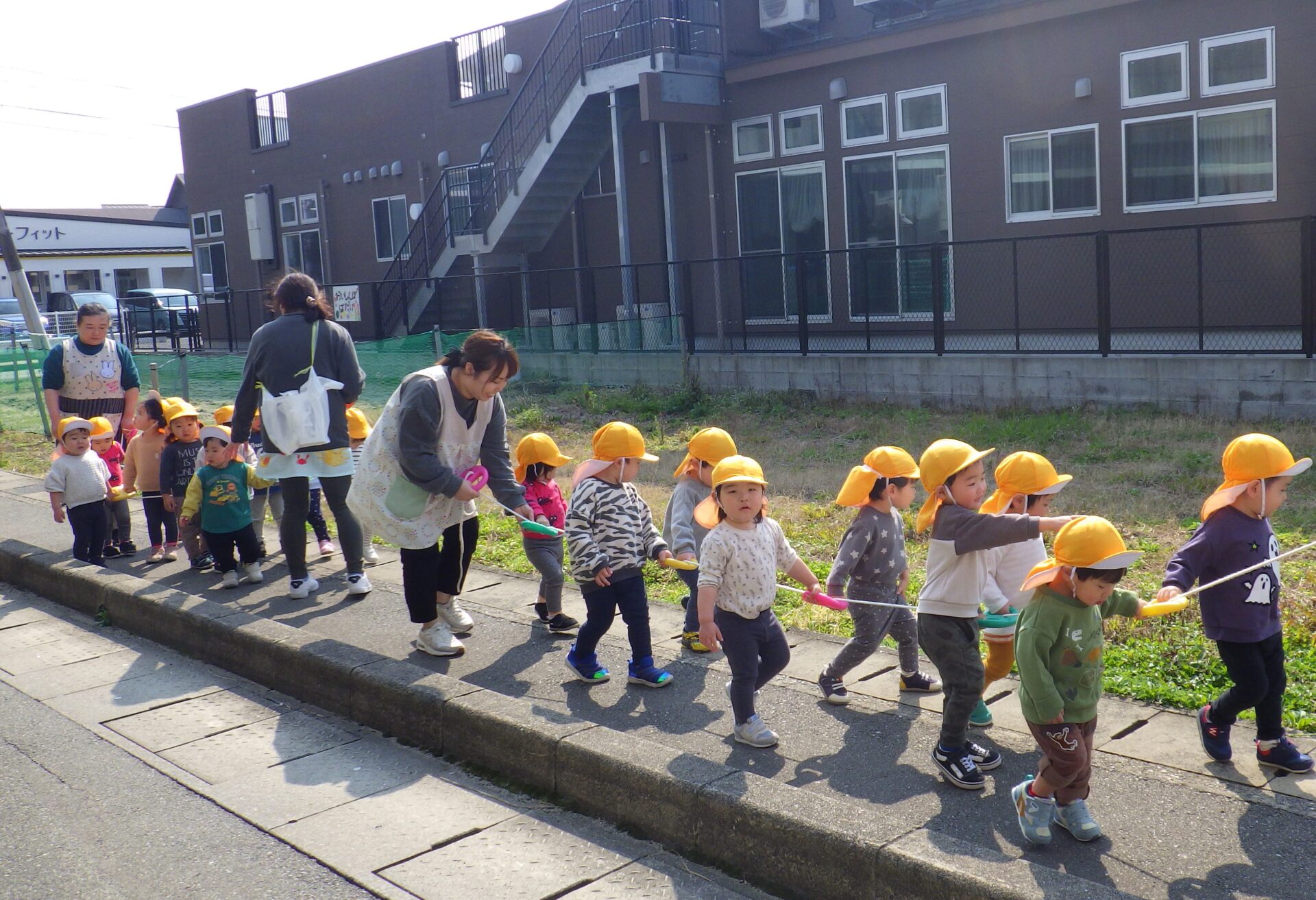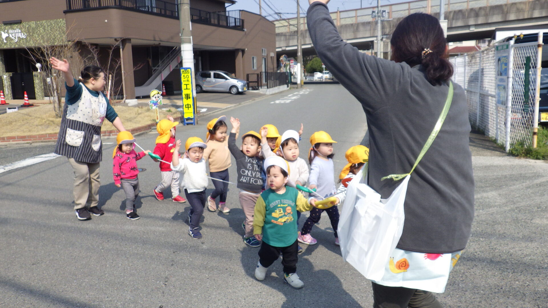 最初は歩きたくないと、泣き出す子もいてお散歩カーに乗って行っていましたが、