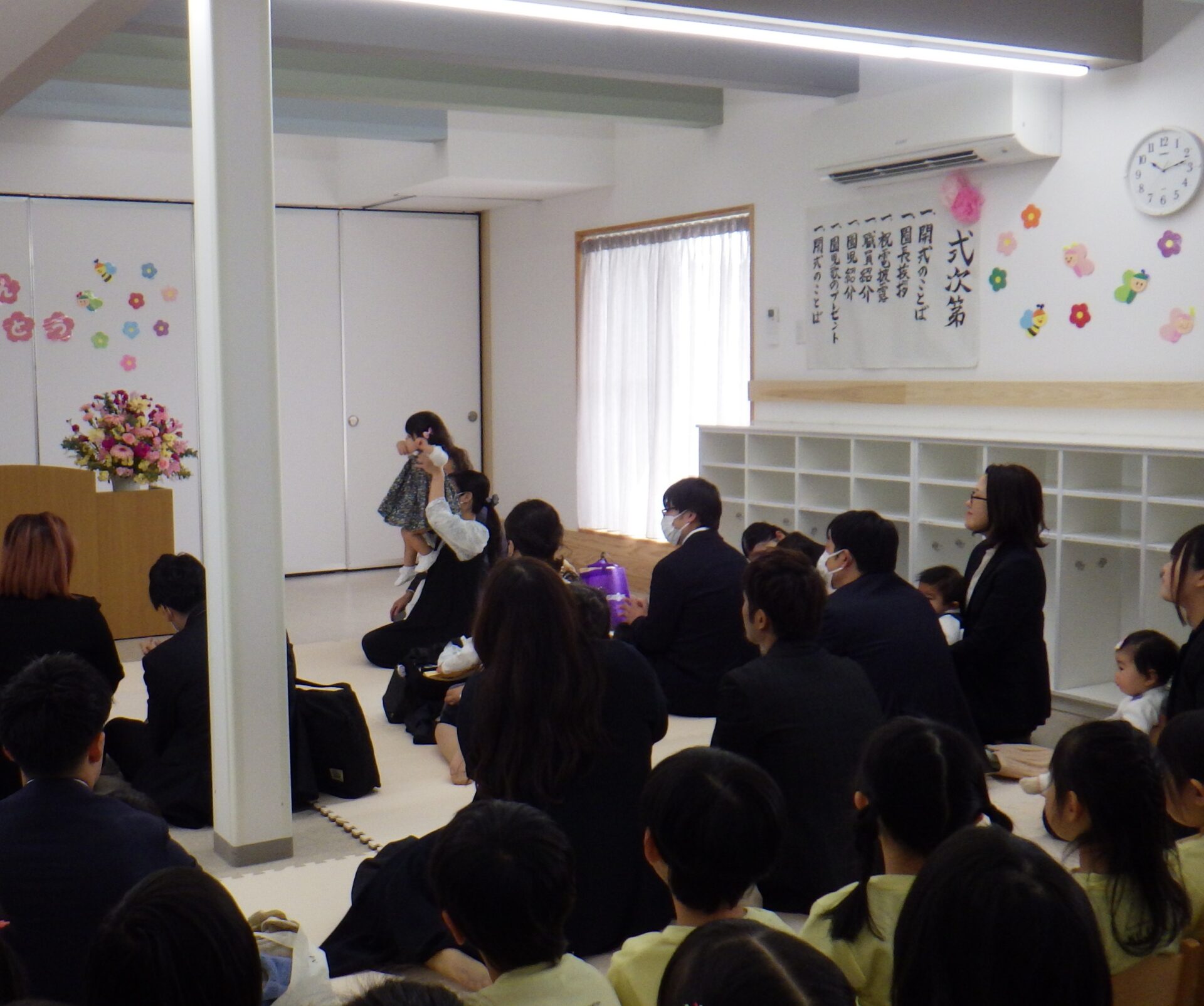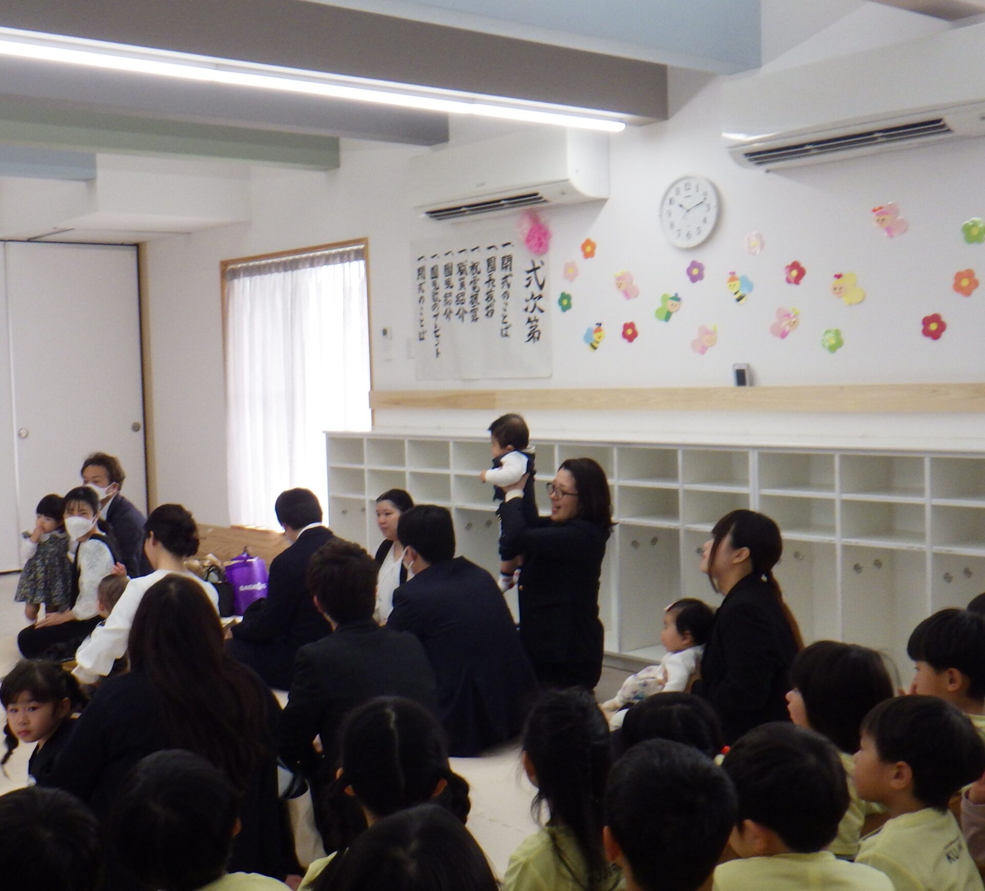 新入園児のお友だちは、お名前を呼ばれるとおうちの方と一緒に元気いっぱい「はーい」とお返事できました。