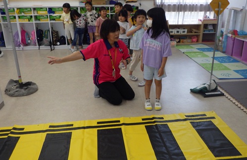 福岡県交通安全協会から2名、筑紫交通安全協会から1名の指導員さんが来てくださり、みんなの『命』を守るお約束を教えていただきました。