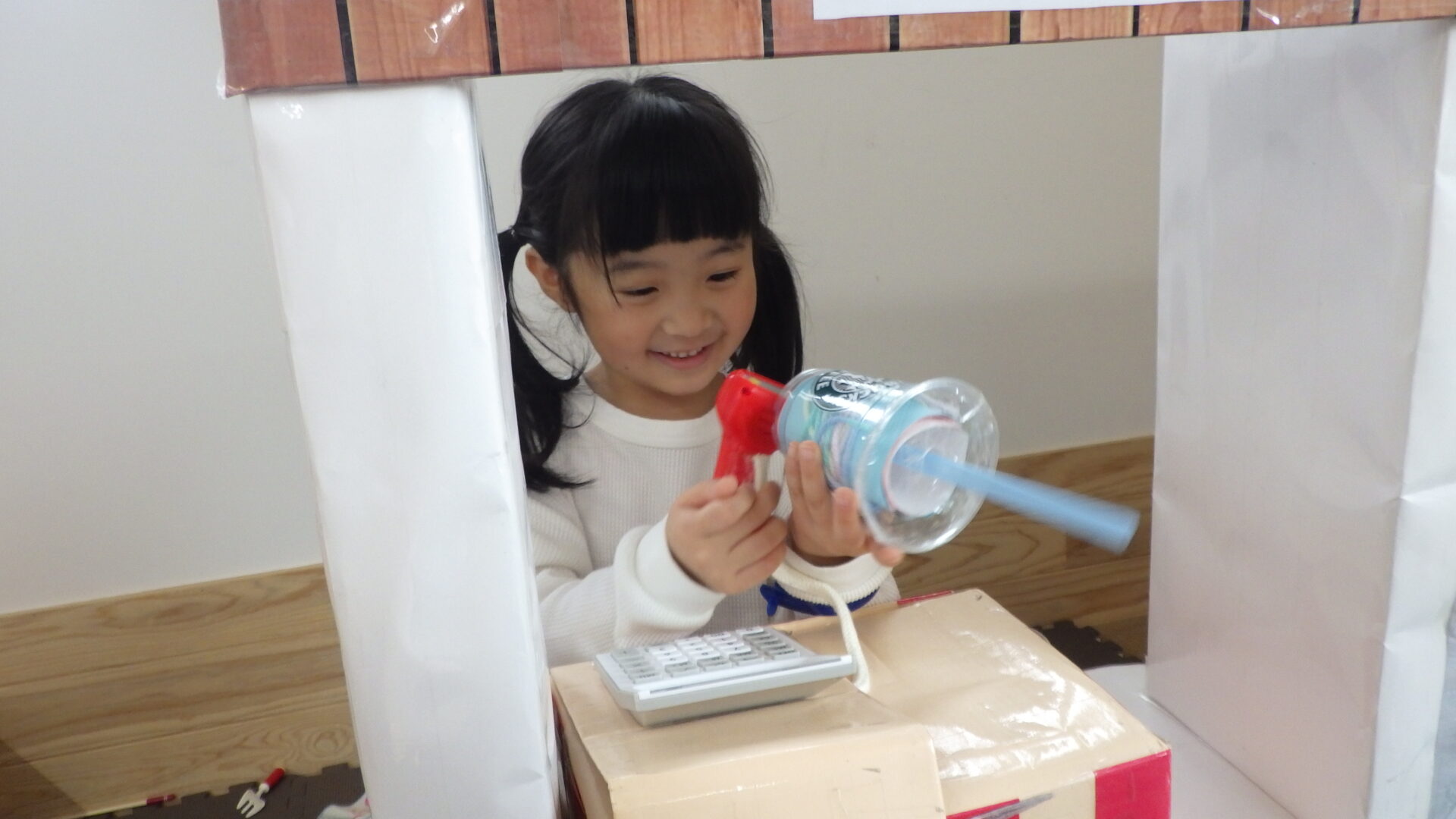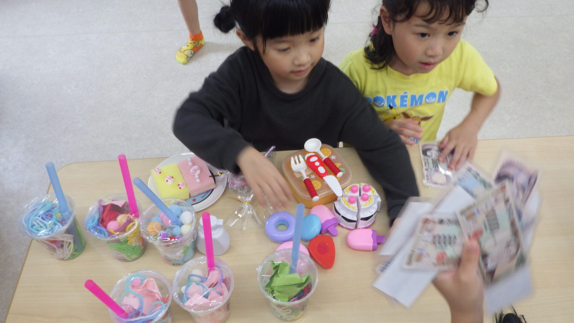 机の上に買ったものを寄せ集め、机の上でもお買い物ごっこ遊びを始めたりと