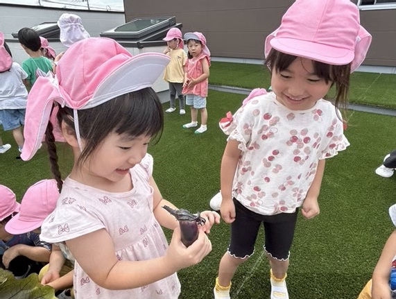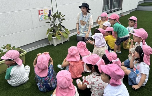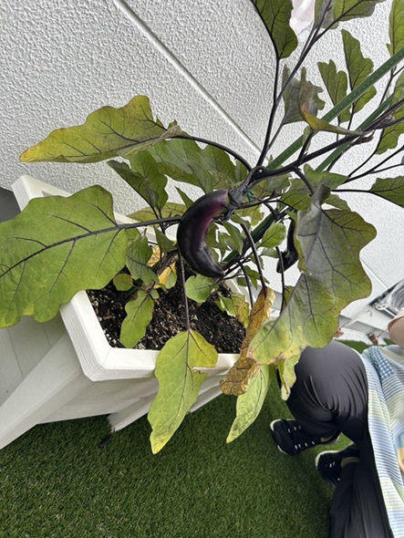 にじ組(3歳児)の子どもたちが、プランターで大事に育てているナス🍆