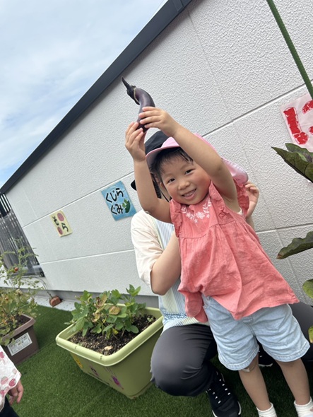 そして、いよいよ!今回はお当番さんがナスを収穫します。