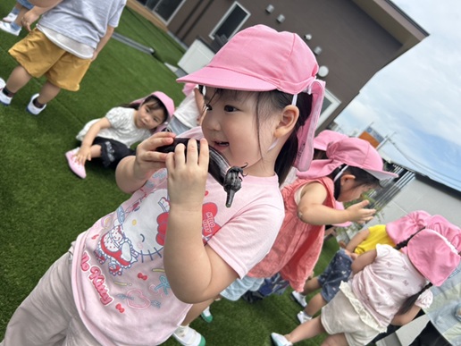 2階のテラスに行くと、2本のナスが実っており、「大きくなってるー!」と大喜びの子どもたち。