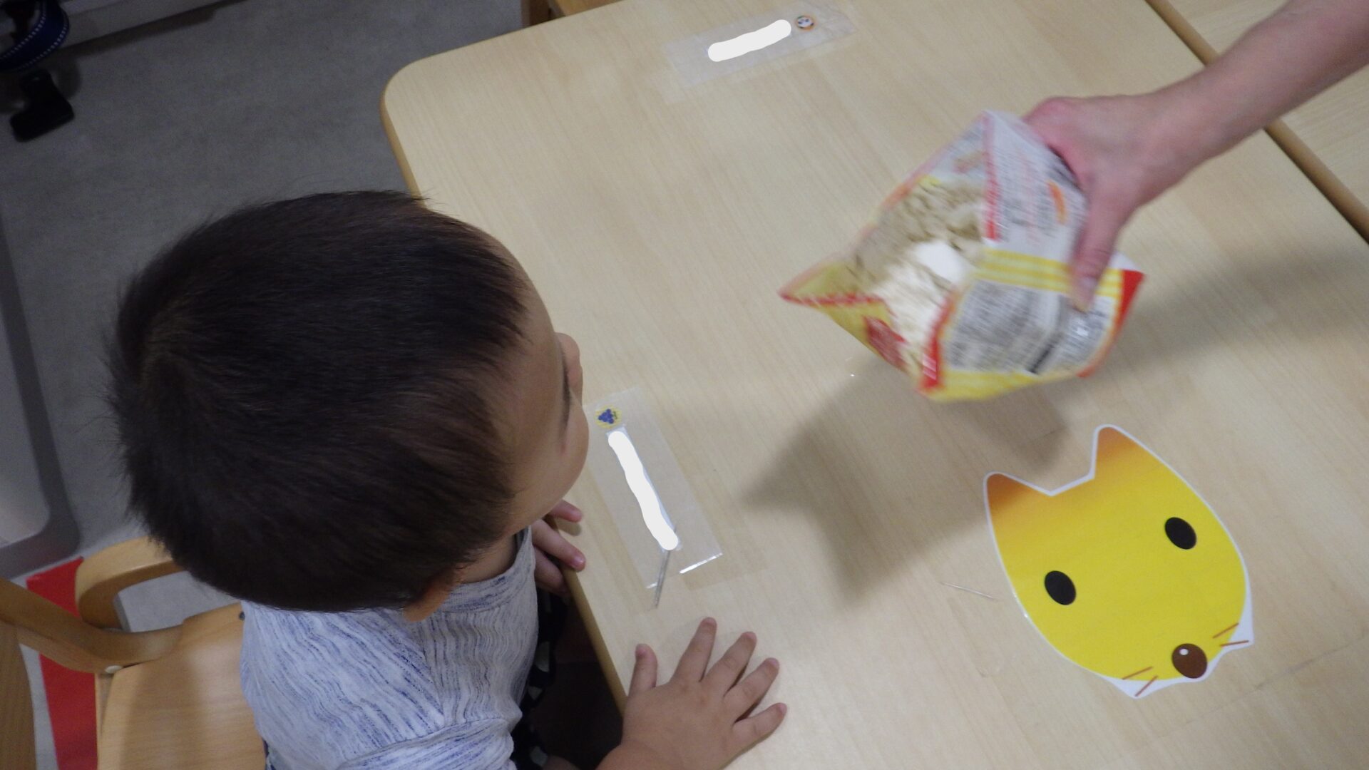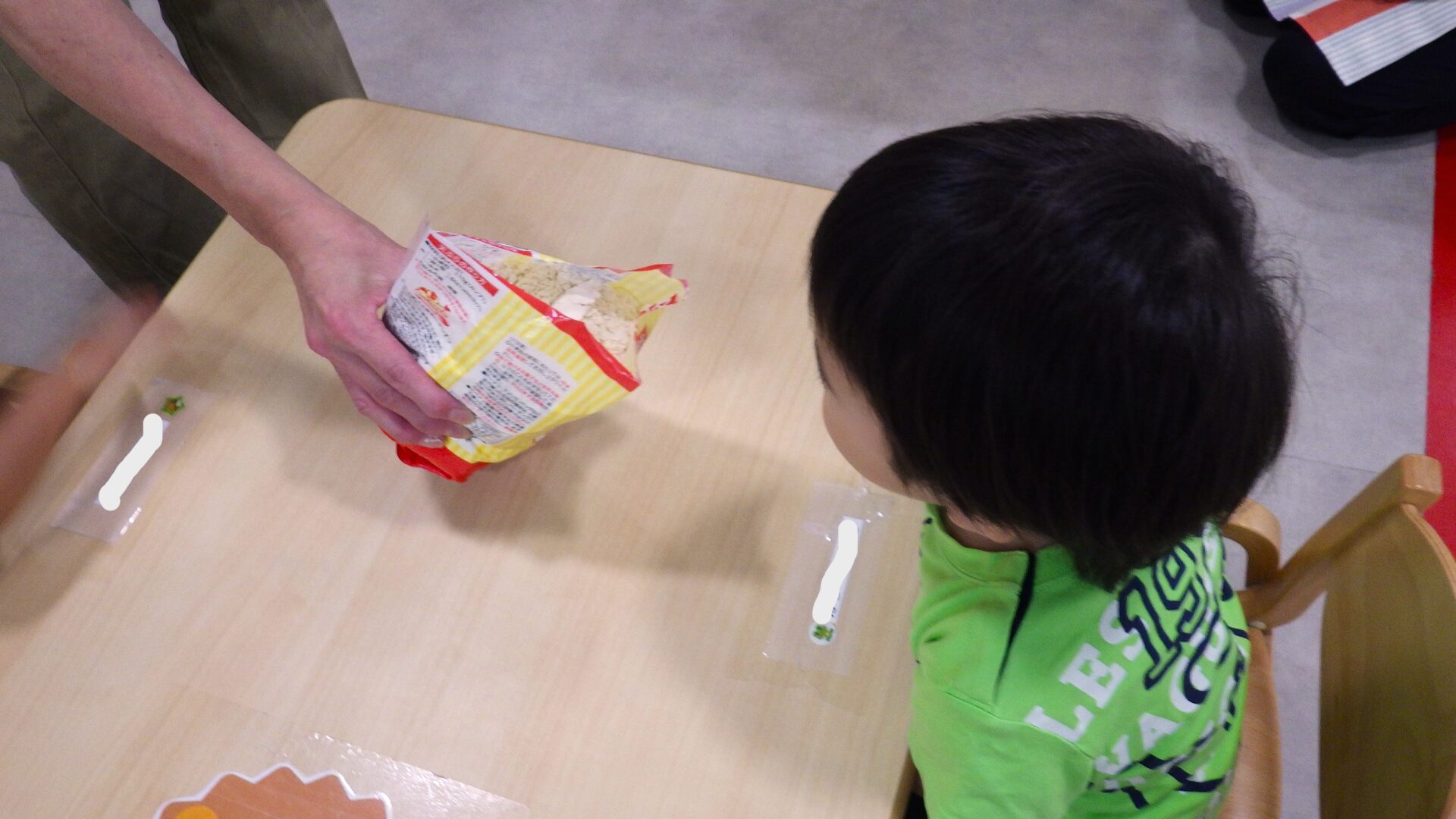 保育士と粉を交互にみて不思議そうな表情をしています( *´艸`)