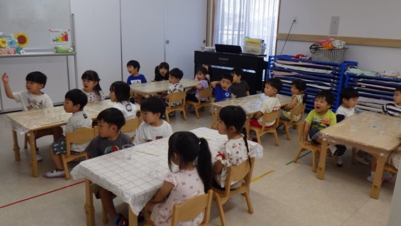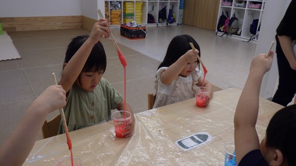 「今日はスライムを作って遊ぶよ♪」と聞いて、子どもたちは大喜び😊