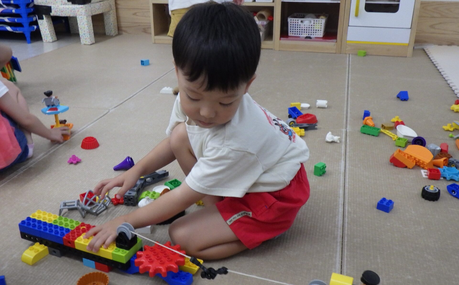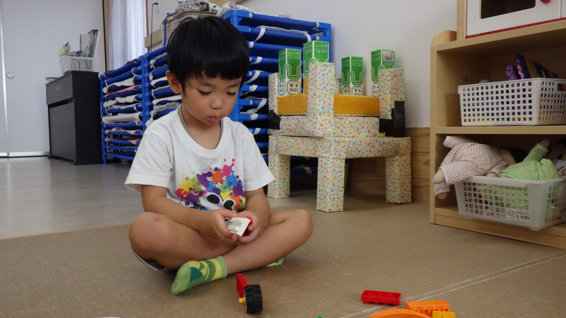 ブロックや電車、ままごと、粘土、ぬりえなど、好きな遊びを選択して、毎日楽しんでいる子どもたち。