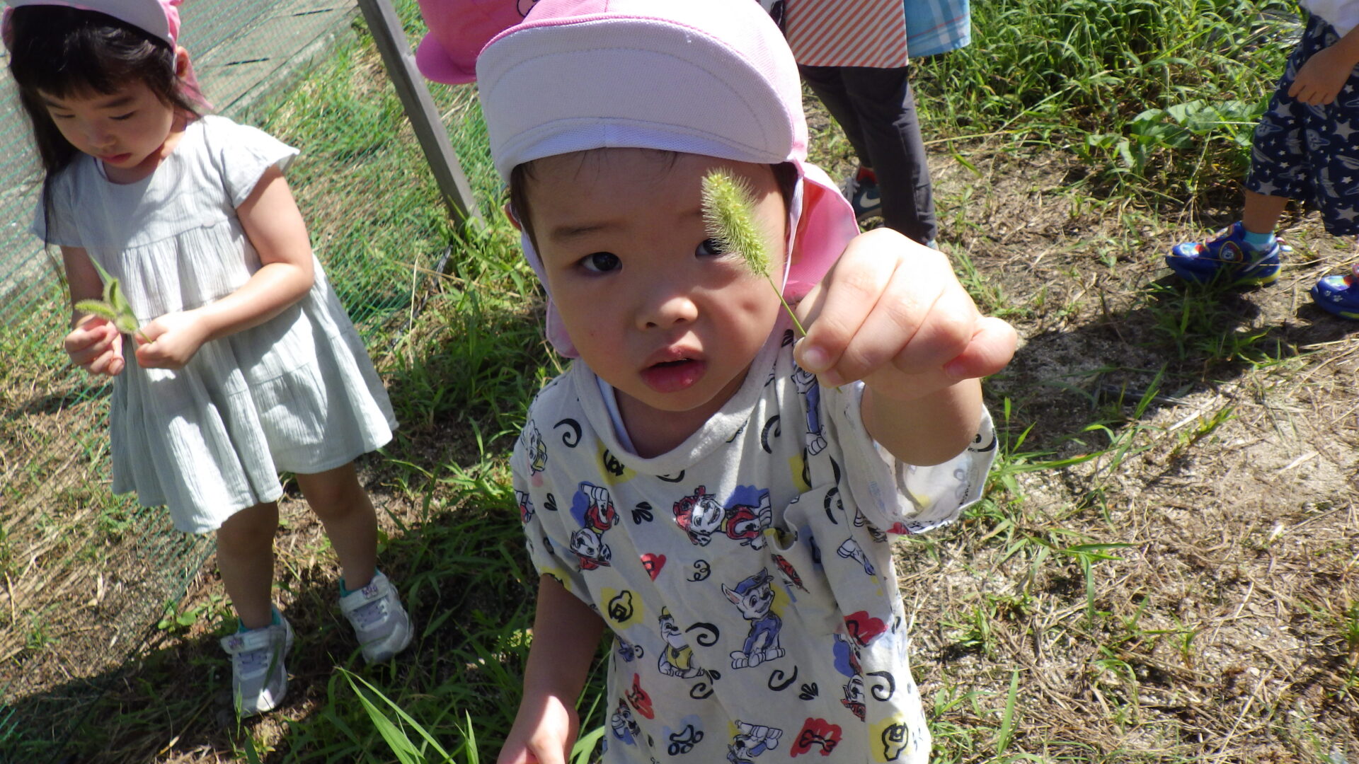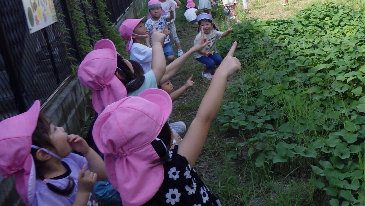 保育園の畑でトンボを発見!「みてみて、トンボがいるよ!」
