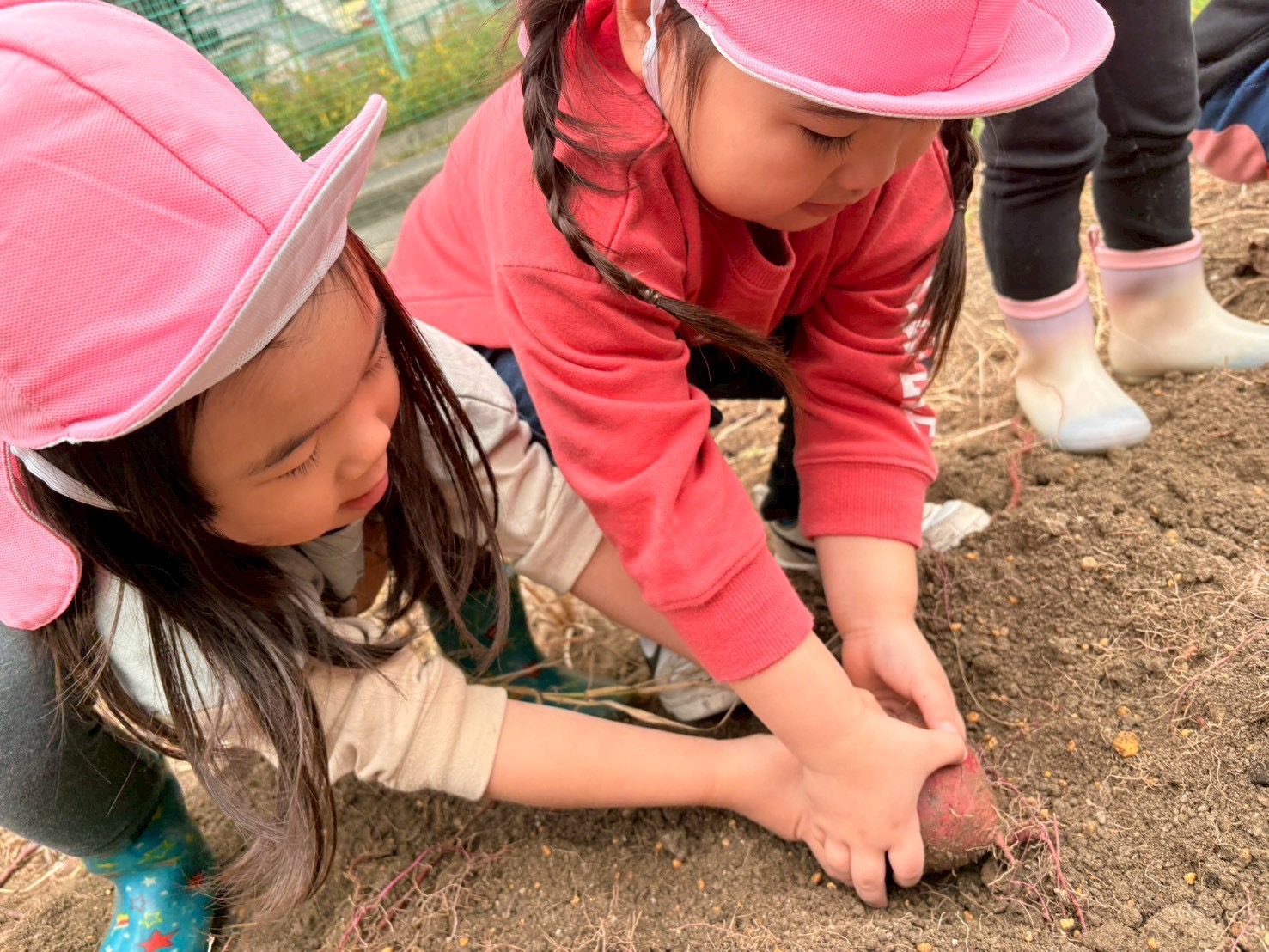 そら組(4歳児)ともなると、周りの土を丁寧に払って、大きな芋を掘り出していきます。とても真剣な表情ですが・・・