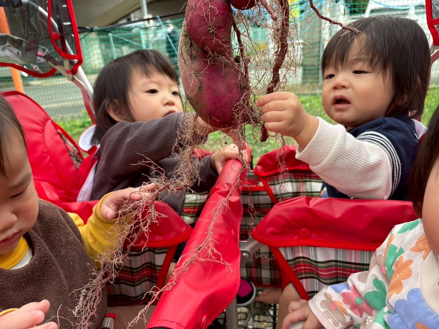 「今度おやつでたべようね~」という先生の言葉に、((これ食べるの?))と不思議そうな顔をするお友だちもいましたが、芋ほりの雰囲気を楽しめて、大満足のうみ組・だいち組さんでした。