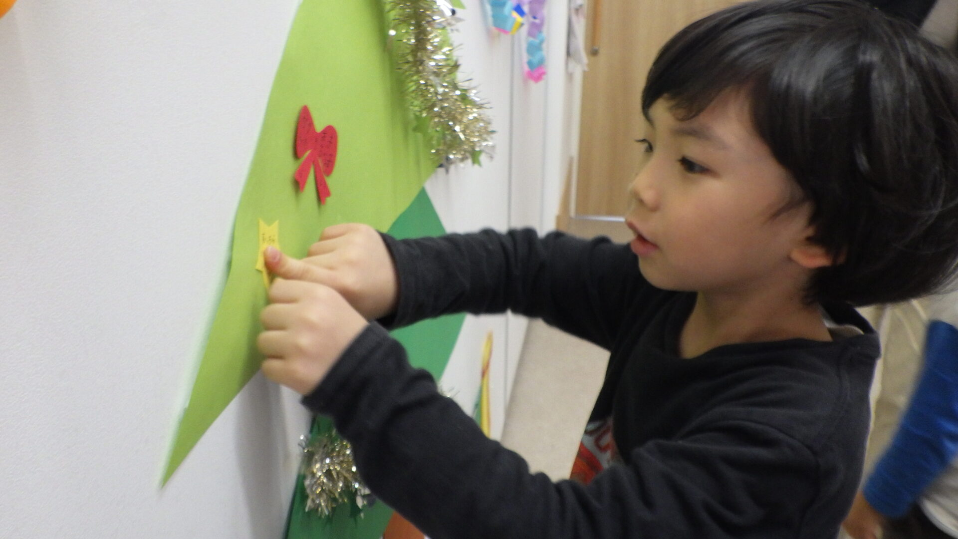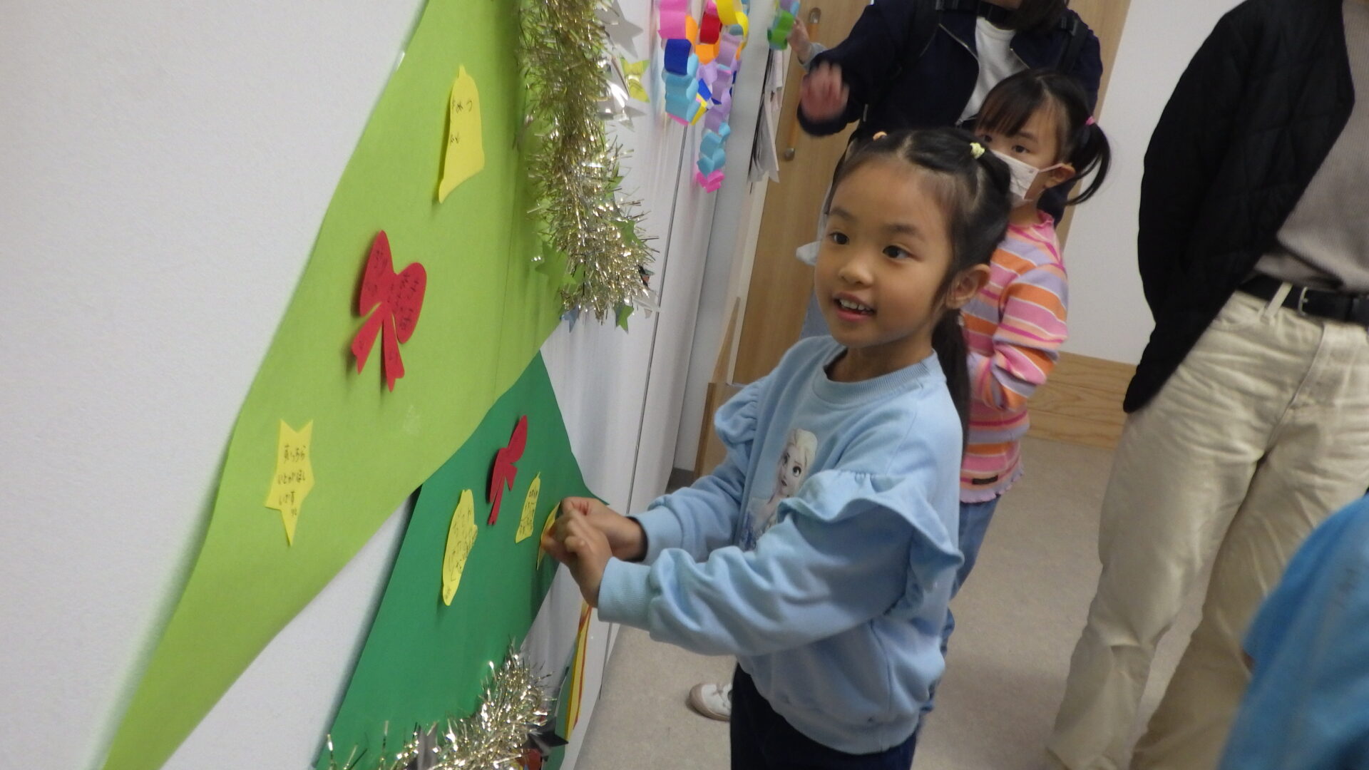 鈴やリボン型の画用紙にお願い事を書き、大きなツリーに飾り付けをしていきます!