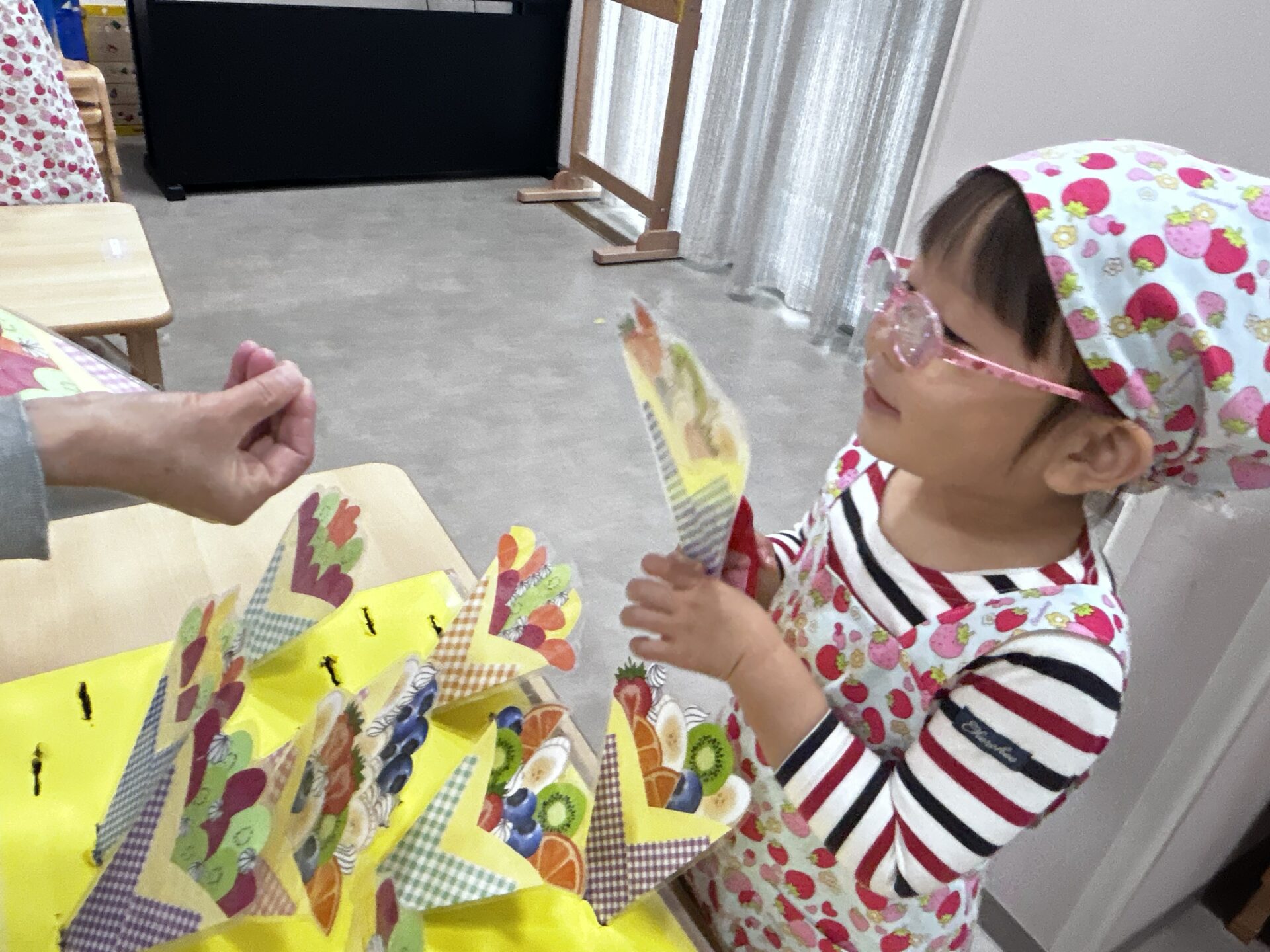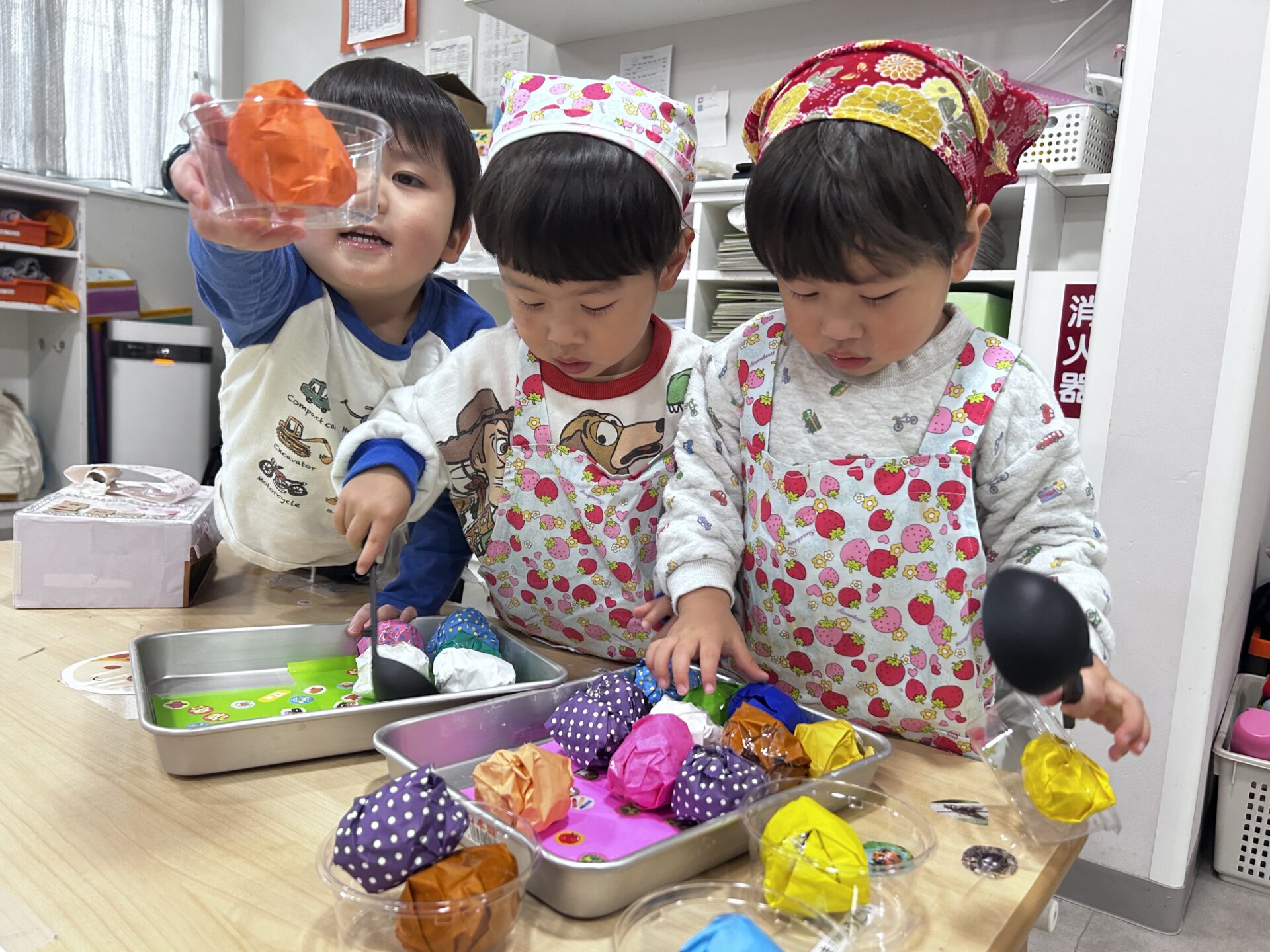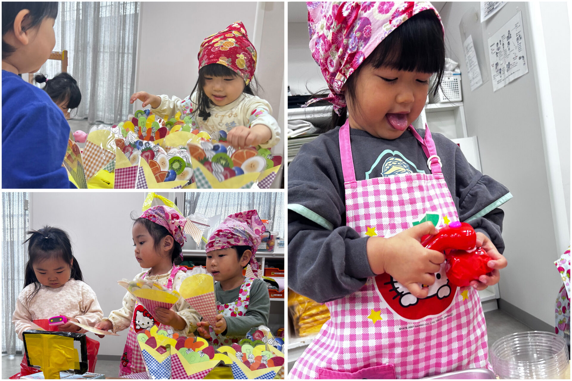 お店屋さんで必須の、エプロンと三角巾もしっかりと身につけ準備万端です✨