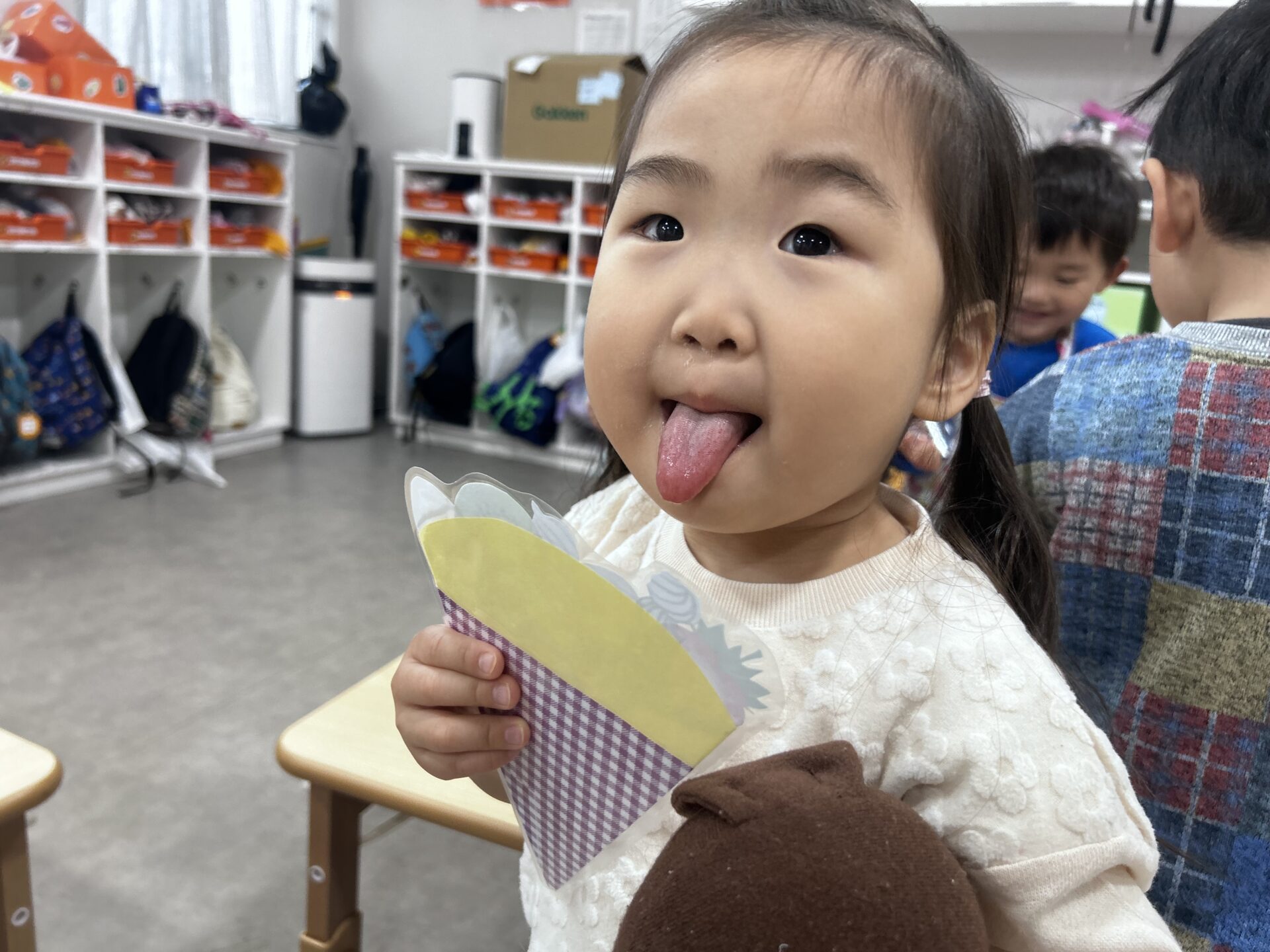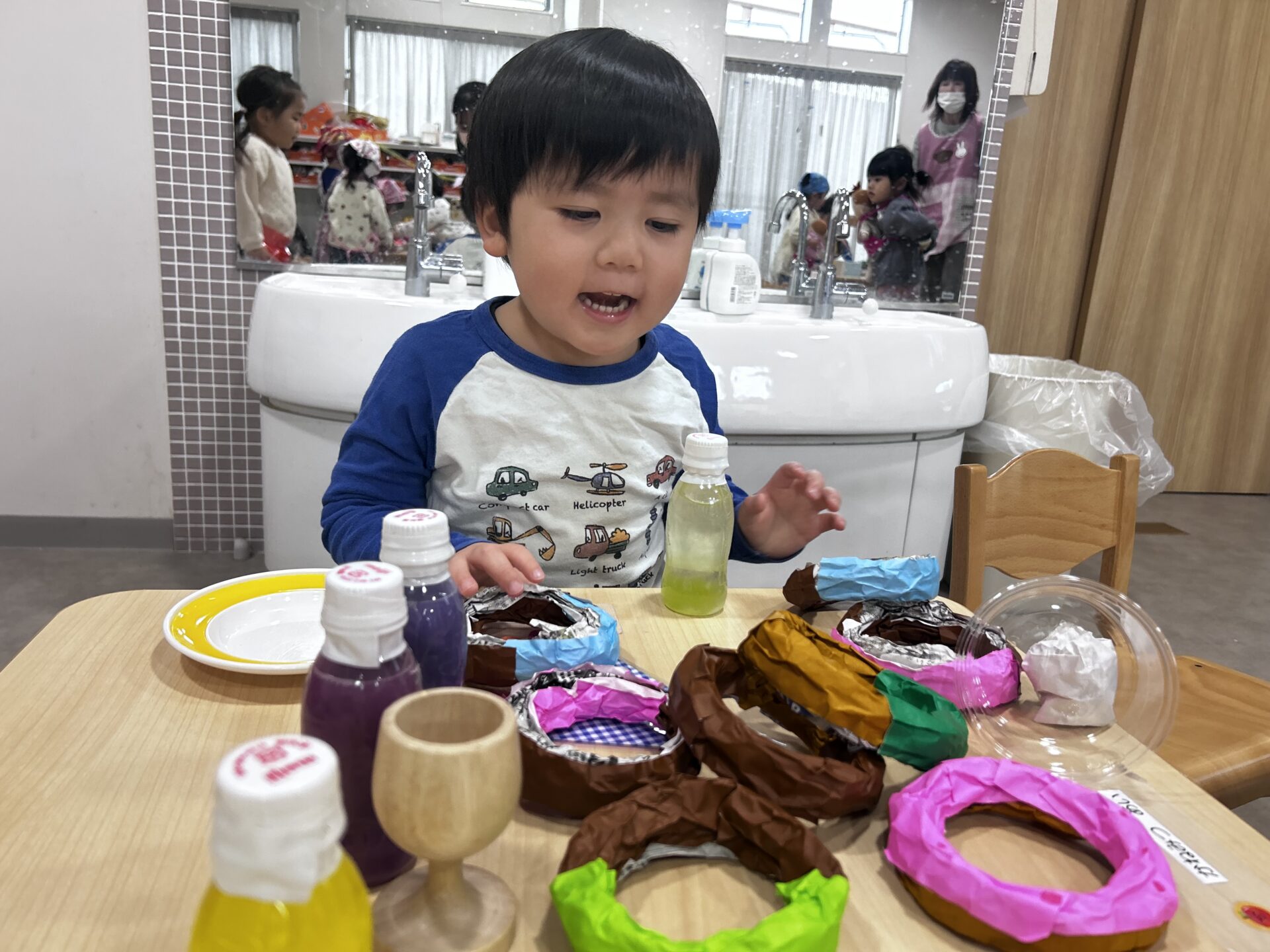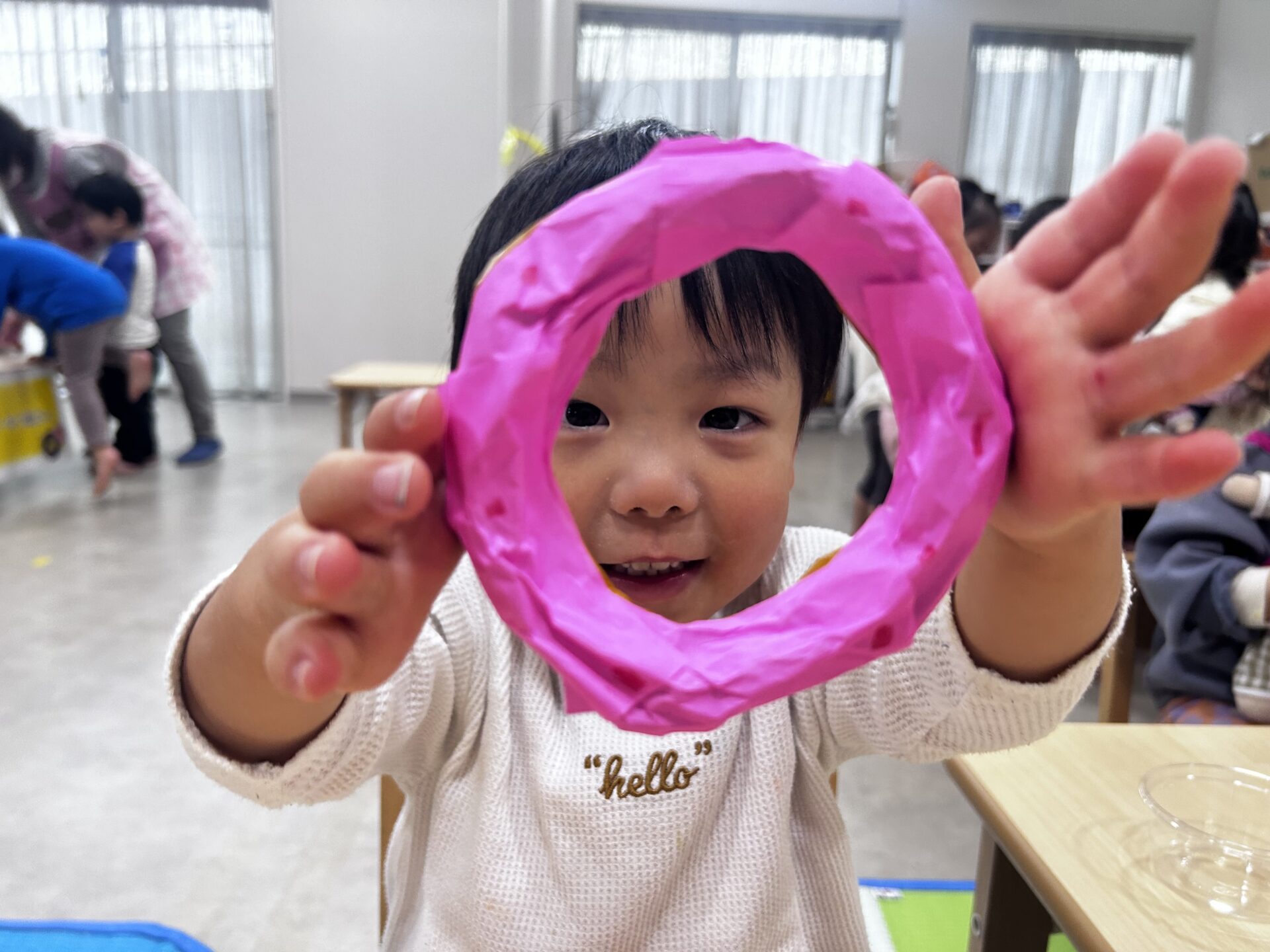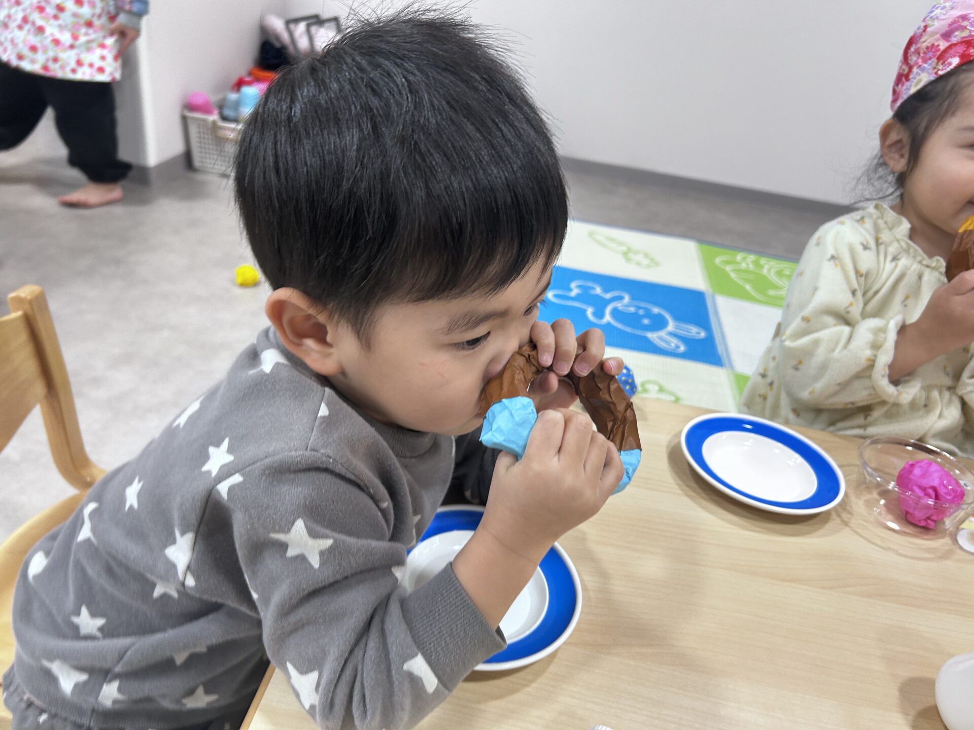 今回は、【ドーナツ屋さん・アイス屋さん・クレープ屋さん】の3店舗があめ組(2歳児)のお部屋で、出店されました(o^―^o)