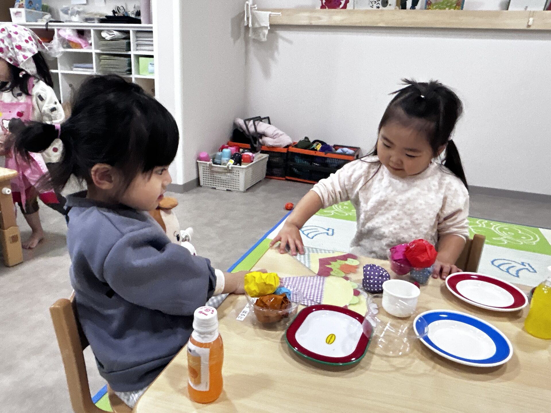 注文を聞き、お皿やカップに食べ物をのせ、渡す、の一連の流れはバッチリで、トングやスプーンの使い方もとても上手な子どもたちでした✊