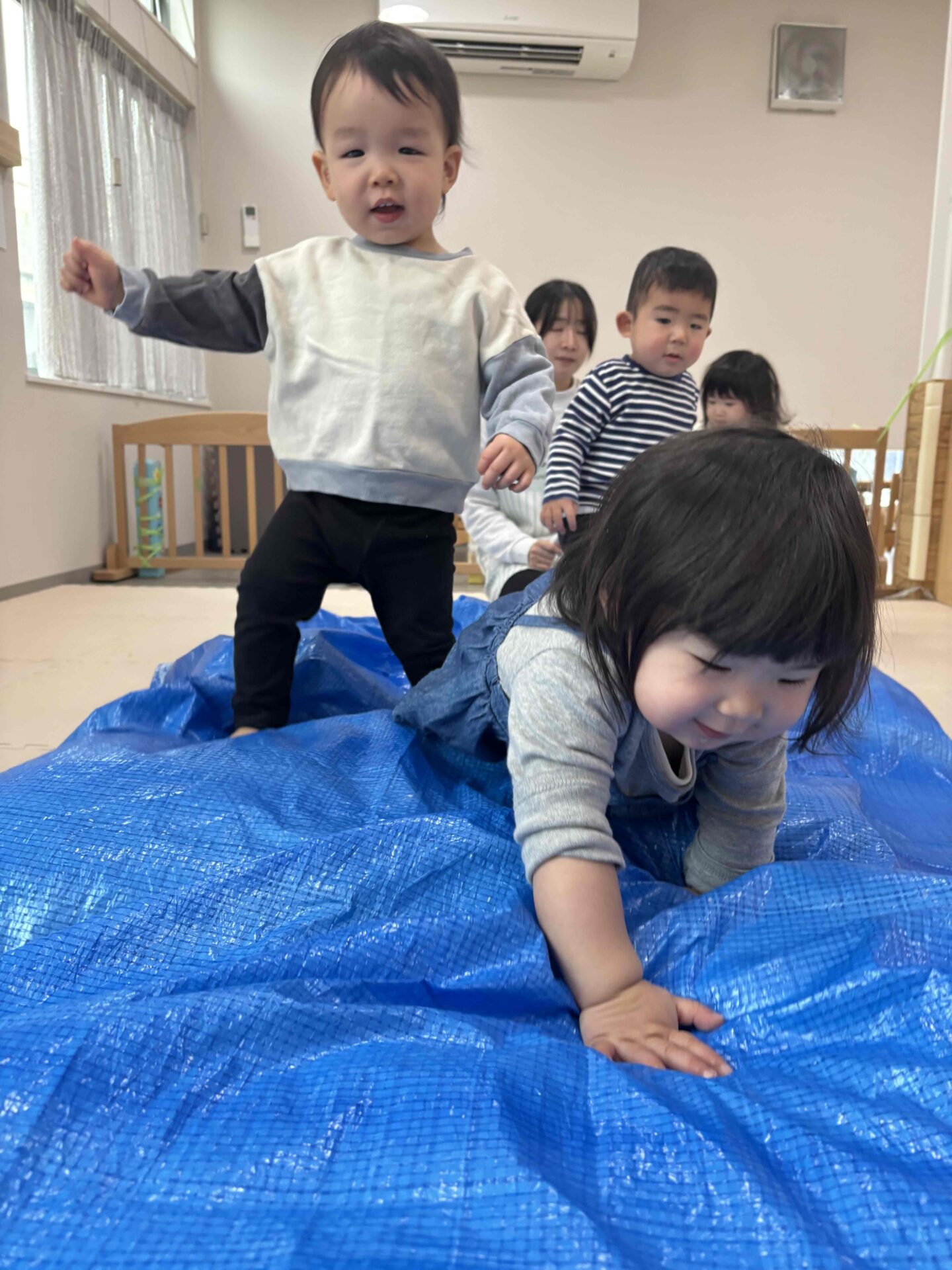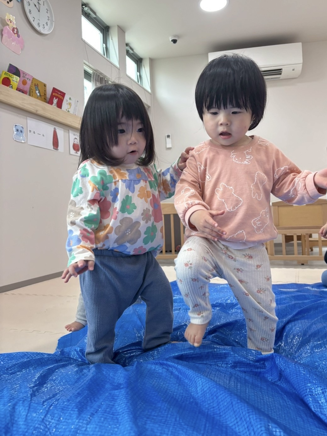 最近一段と体力がついてきたうみぐみ(0歳児)、園庭や散歩だけでなく室内でも