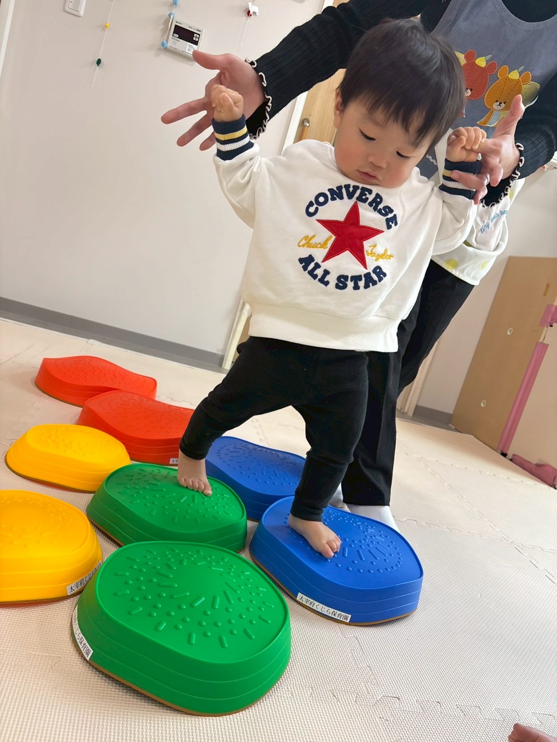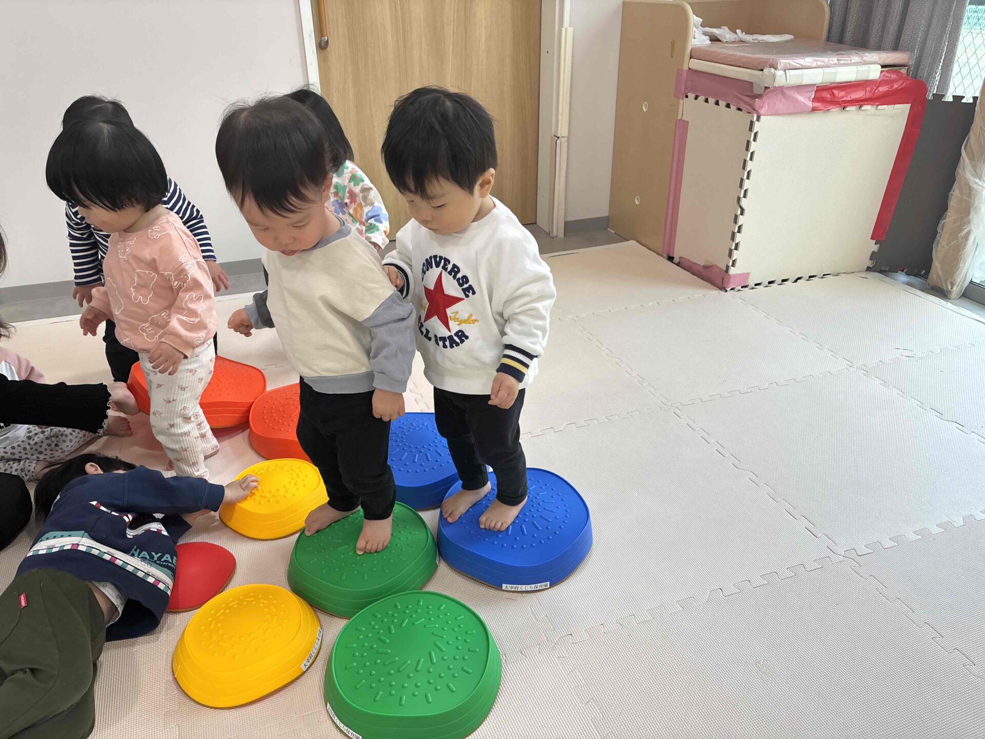 初めてのバランスストーン!これも初めは保育士と手を繋いで渡ってましたが、その後