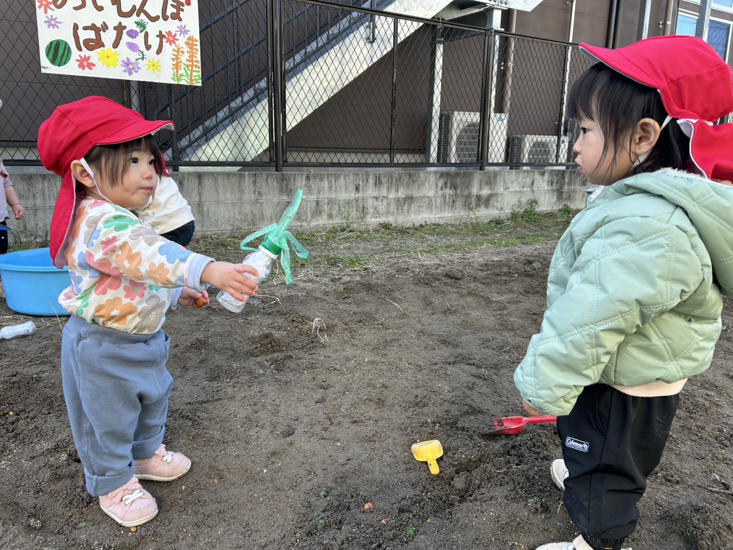 みんなで作った野菜たちは、おおきくなぁれとおまじないをかけて、畑に植えました。