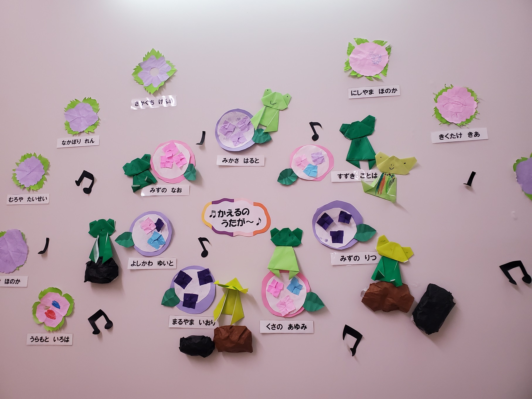 ふと、園内を見ると、そら、くじら組の作品が・・・カエルの合唱のように、賑やかです。