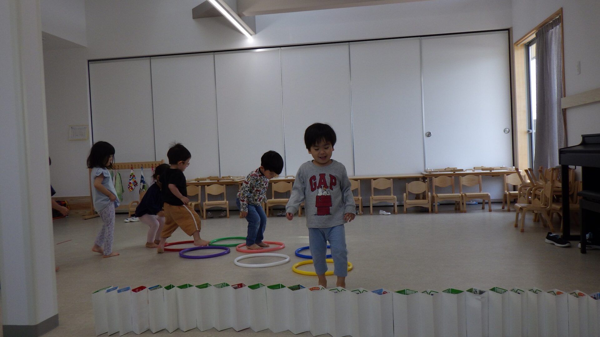 フラフープジャンプと両足ジャンプも身体を使って上手に飛んでいます。「飛べたよー!」とにこにこ笑顔!