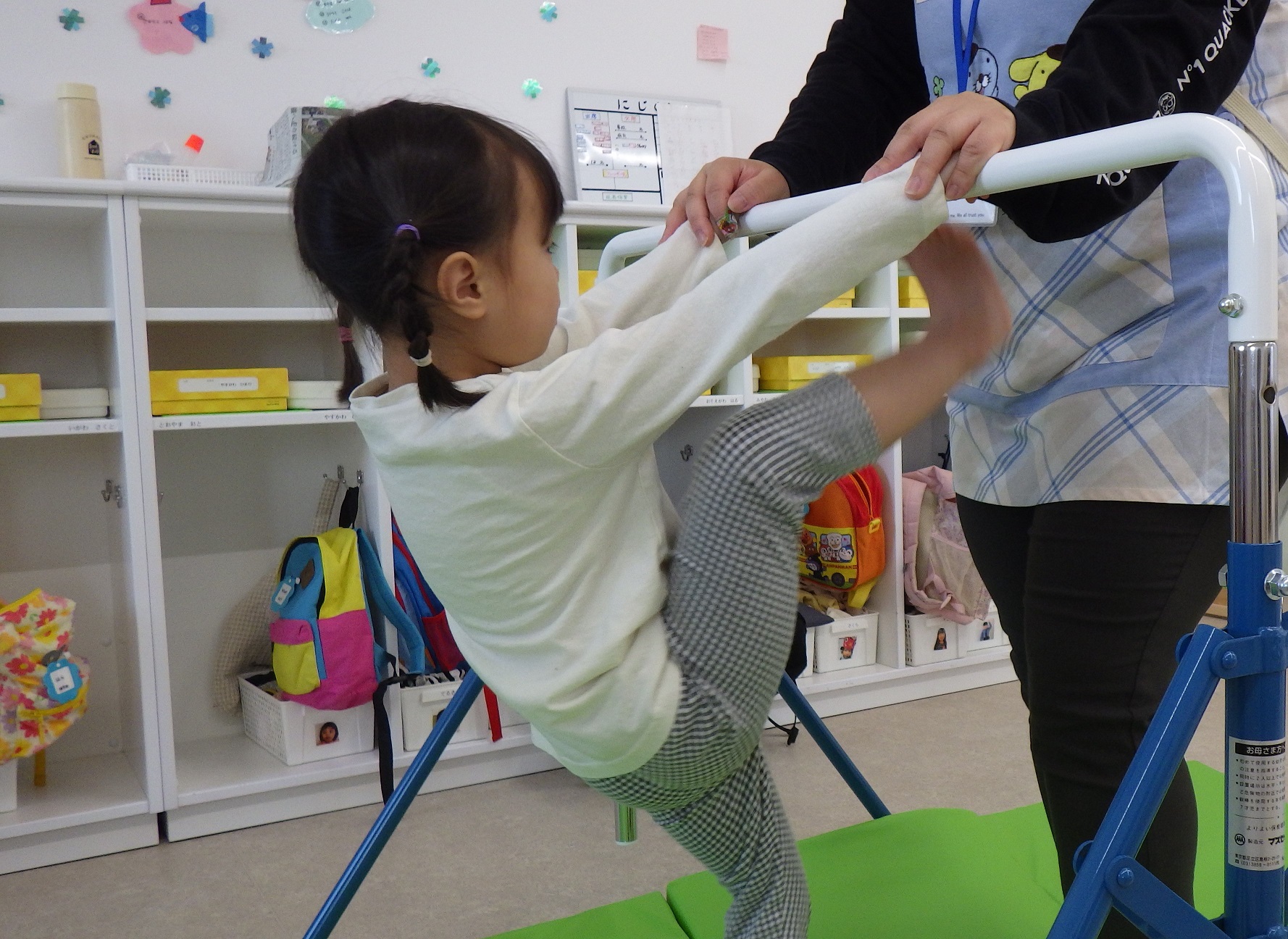 鉄棒が大好きなにじ組さん。保育士が補助をして足抜き回りに挑戦!