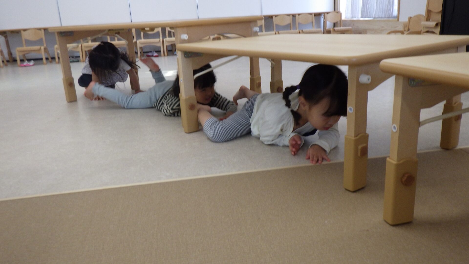 リズムの両生類のハイハイが上手になってきた子どもたちは、机くぐりもすいすい。足の親指と手の力を使って上手にくぐっています!「あとちょっとでゴールだ…」
