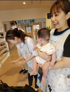 お泊り保育初日、玄関で「行ってらっしゃ~い」と見送ってくれた先生たち