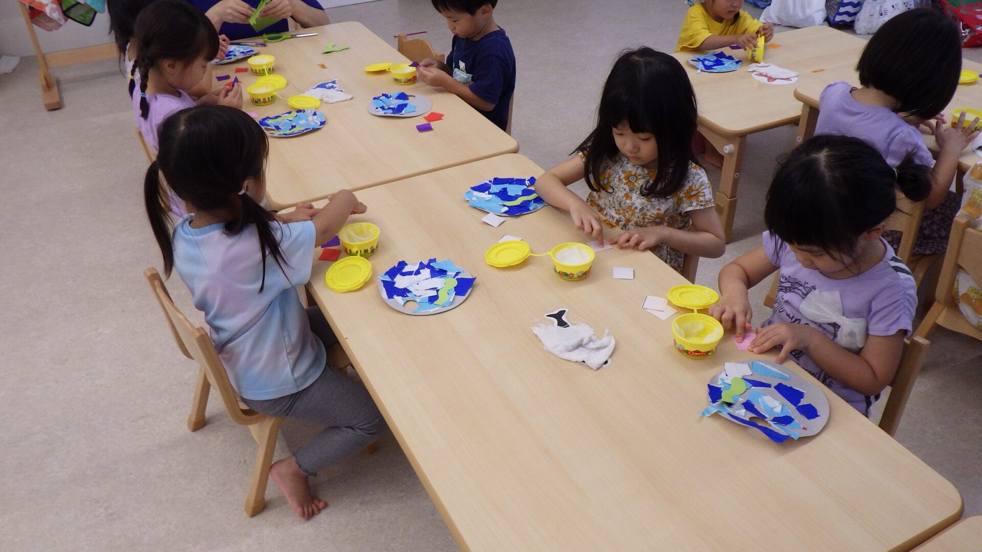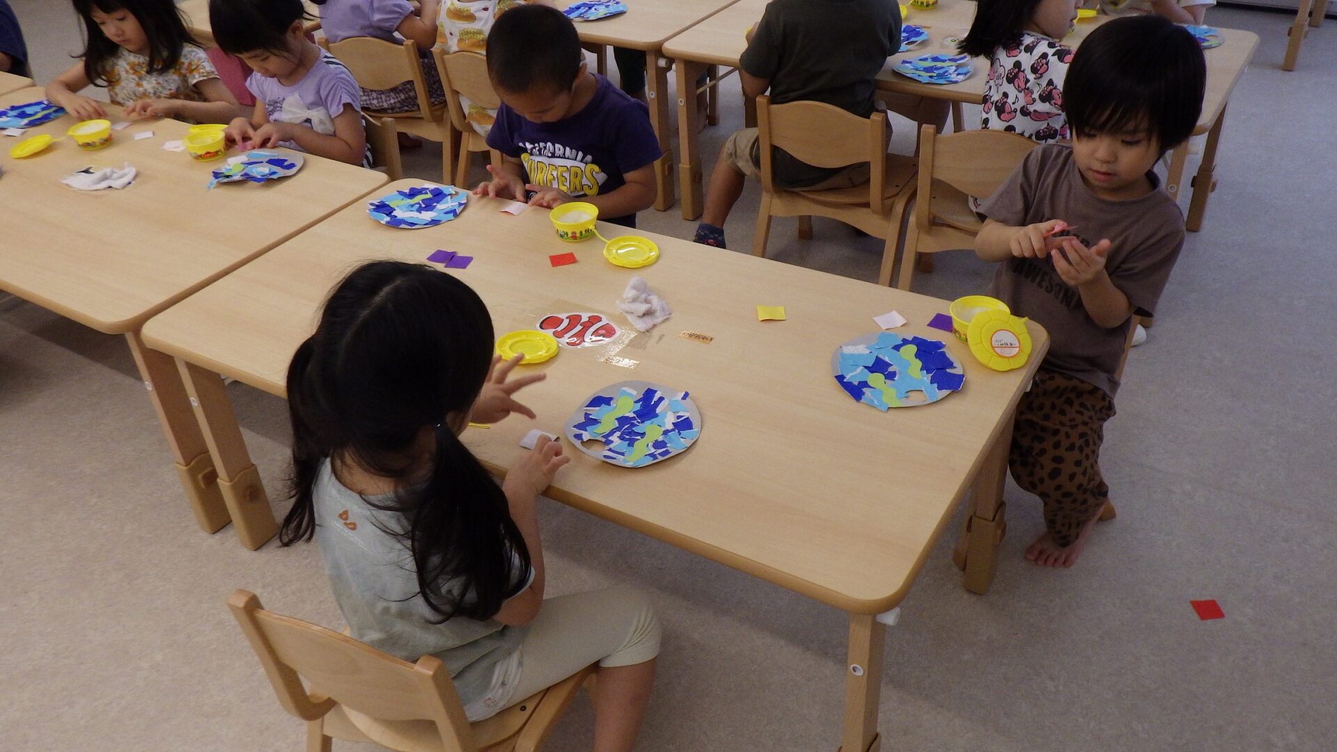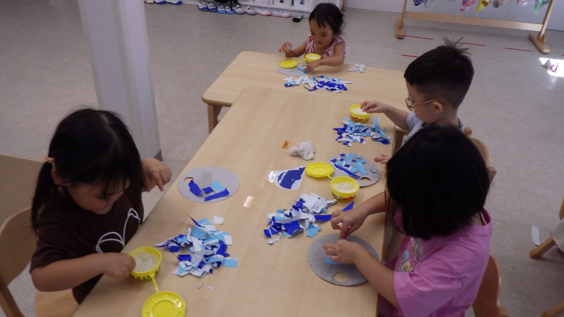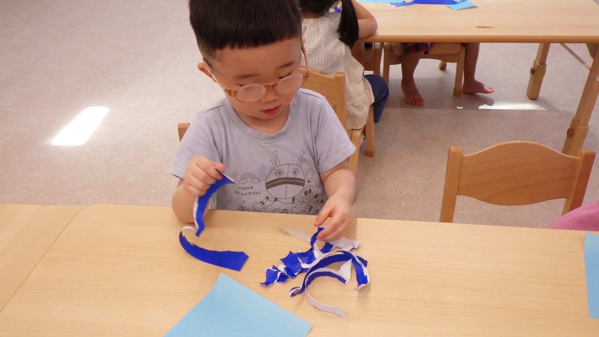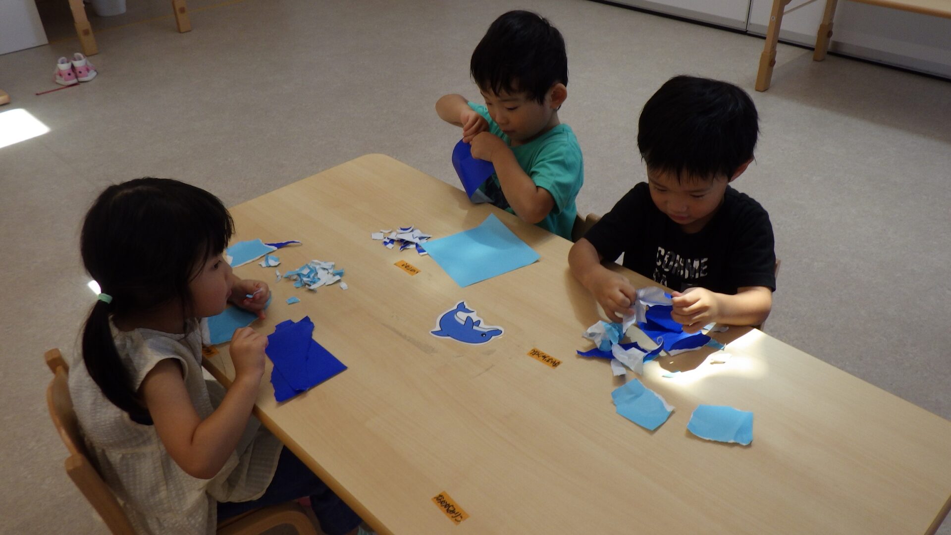 子「うみってきれいな色してるから、きれいに、貼らないといけないね。」