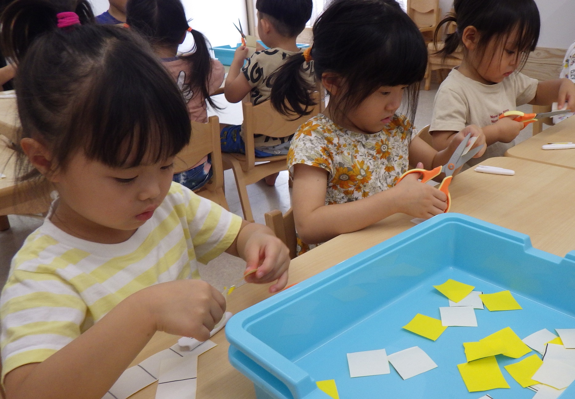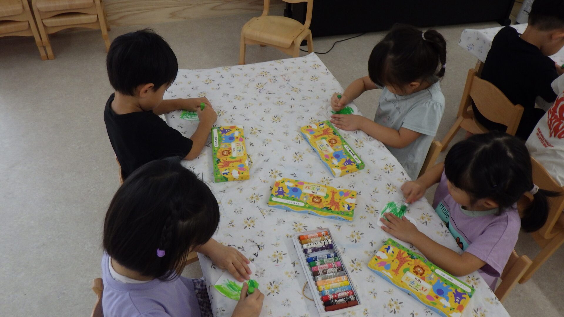 色の指定はせずに、好きな色で葉っぱを仕上げる子どもたちです。