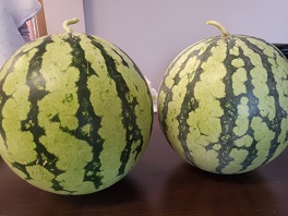 前回採れたスイカは、同じ種類とは思えませんね。6個中2個は腐れてしまいましたが、2本の苗から、4個も収穫出来てよかったね。