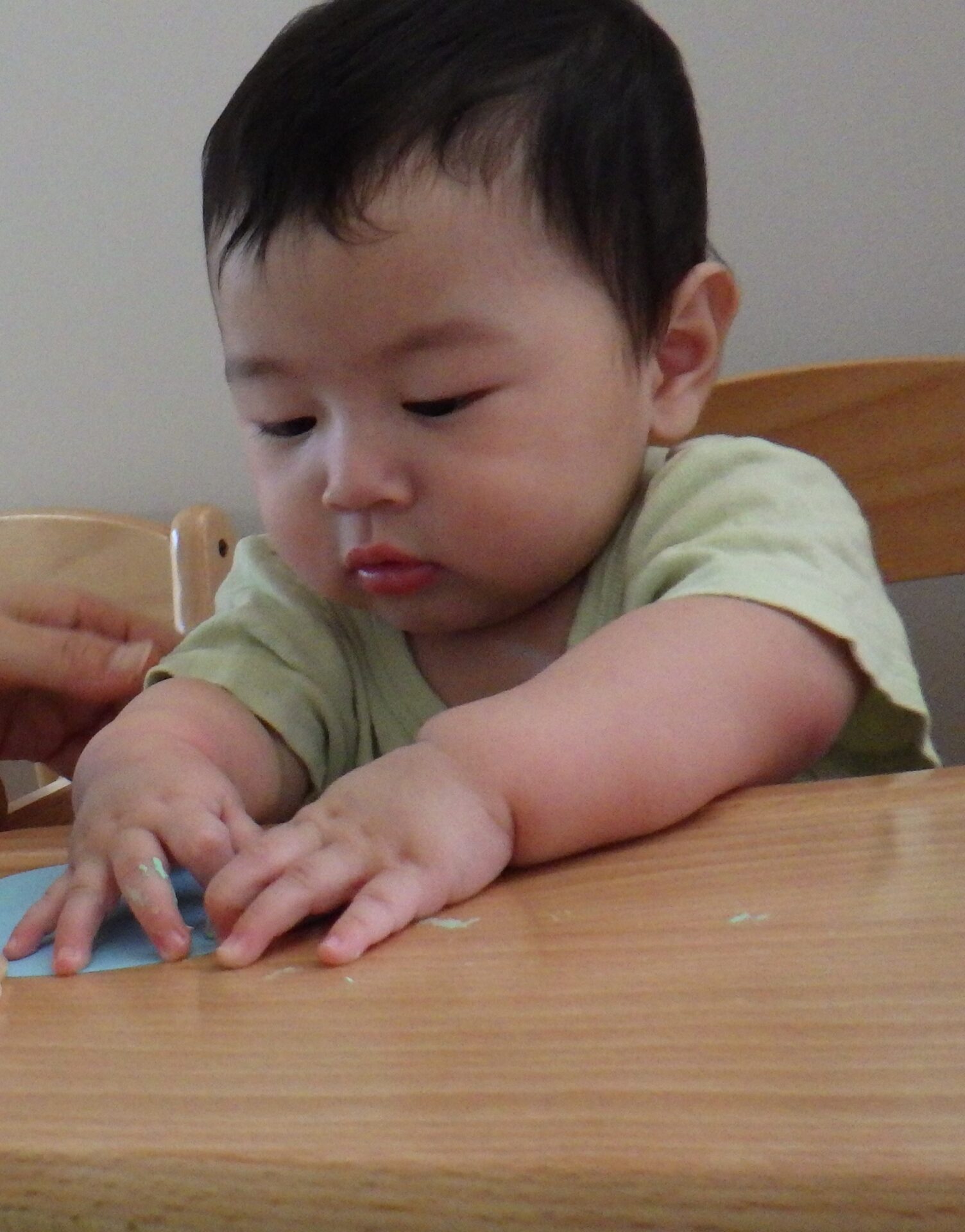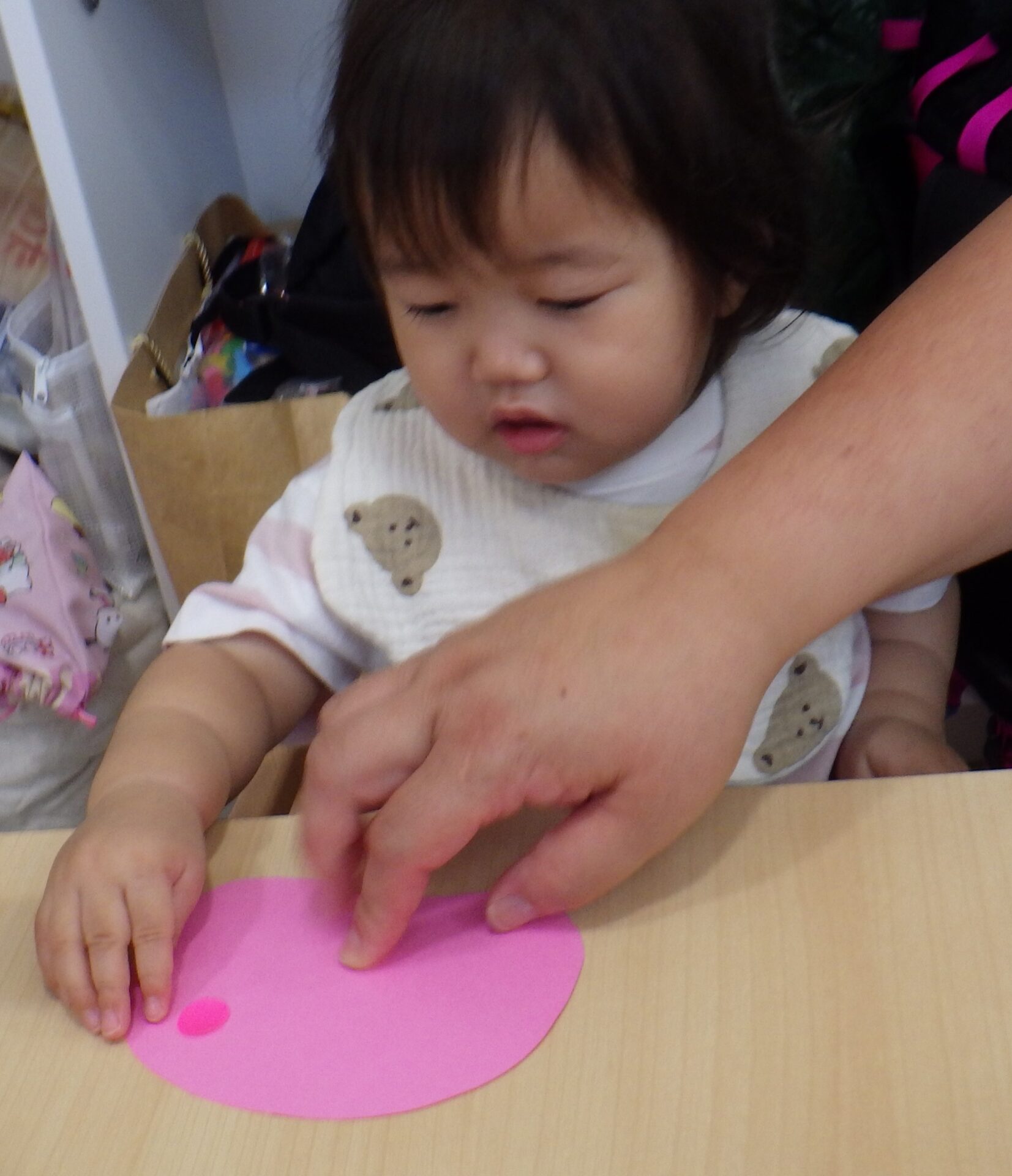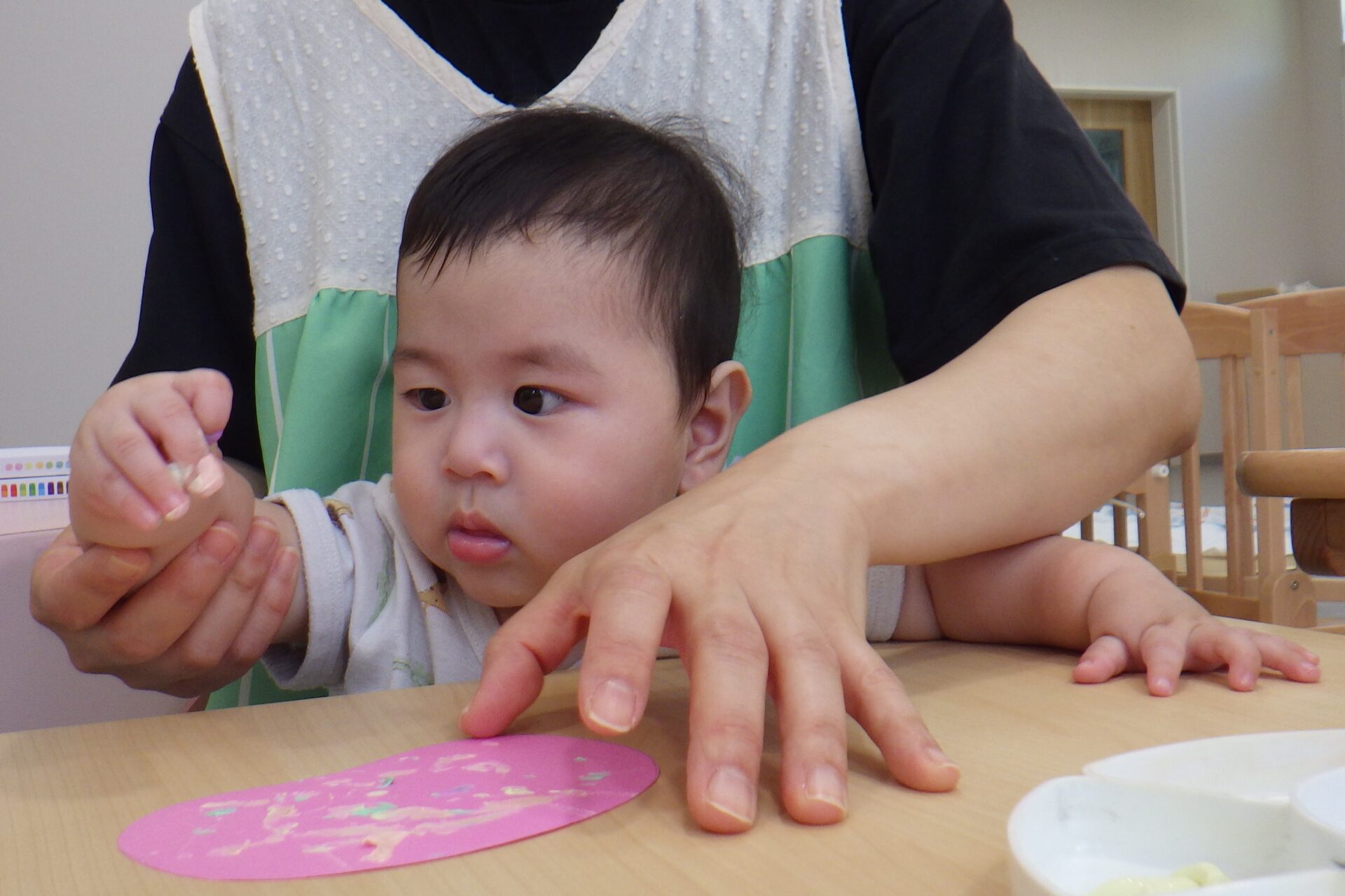 0歳児にとって、指先を使って接着面を下に持つ事は、とても大変です!!