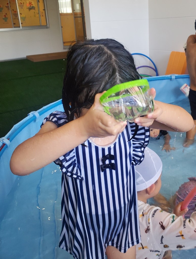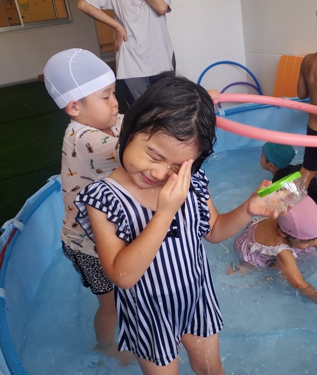 大きいプールに初めて入った、あめぐみさん、水かけっこも楽しそうですね。